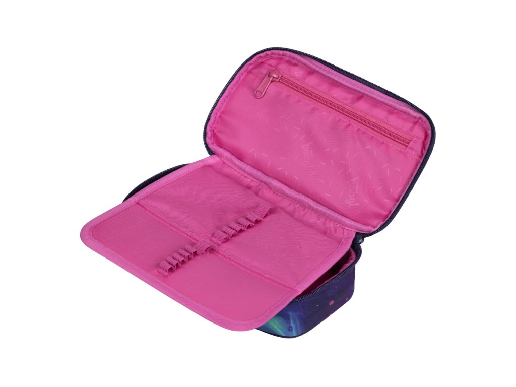• Kompaktní penál na zip s prostornou hlavní komorou a dvojitou výklopnou chlopní nabízí dostatek prostoru pro psací potřeby i drobnosti.• Součástí penálu je také vnitřní kapsa a okénko na rozvrh hodin.