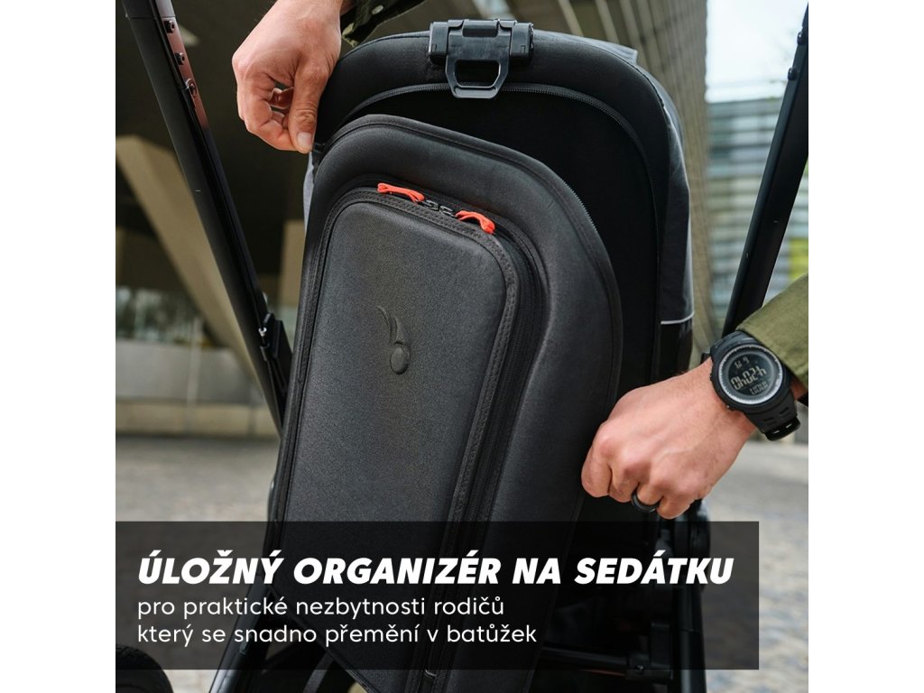 - Zadní úložný organizér s místem na telefon a láhev s vodou, který lze odepnout a použít jako batoh.