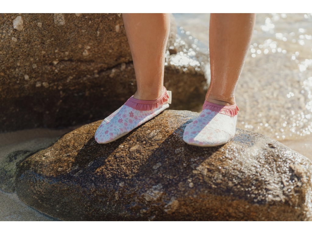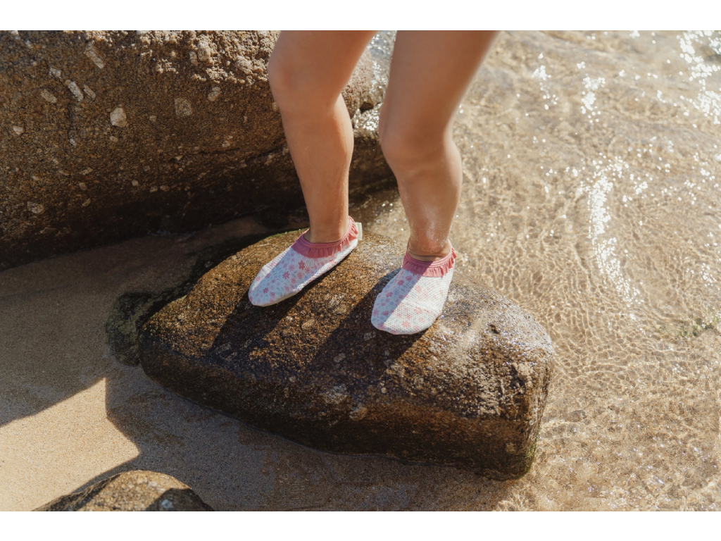 Boty do vody z pružného materiálu s krásným potiskem ochrání nožičky vašeho dítěte před horkým plážovým pískem i před uklouznutím u bazénu. Elastické provedení usnadňuje nazouvání i vyzouvání botiček. Složení: 94% recyklovaný nylon, 6% spandex Možno prát v pračce na 30°C. Po každém použití propláchněte v čisté studené vodě.Doplňkové parametry