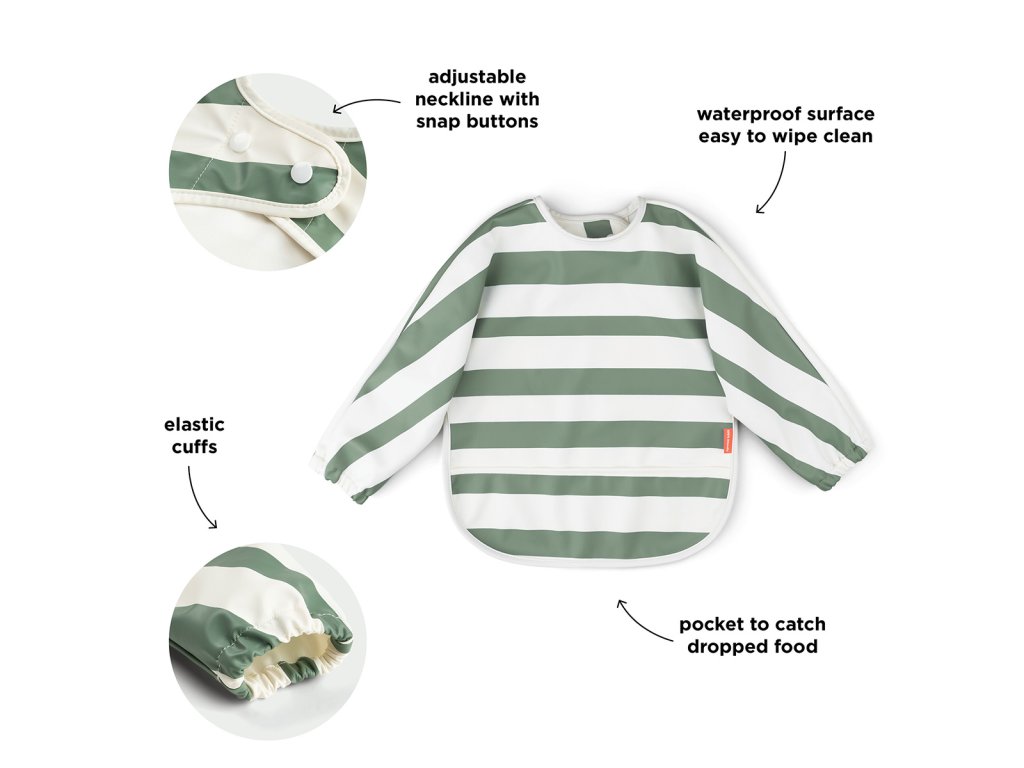 Tento roztomilý bryndáček v hezké barvě. Bryndáček zajišťuje čistotu svým voděodolným povrchem a chrání oblečení před politím a nepořádkem. Rukávy udržují oblečení vašeho dítěte v bezpečí. Vybaveno praktickou kapsou pro zachycení upuštěného jídla. Nastavitelné zapínání s patentkami zajišťuje bezpečné a pohodlné nošení pro vaše nejmenší. Udělejte si jídlo stylově a bez stresu s tímto roztomilým a praktickým bryndákem. Tento materiál je testován a vyhovuje nařízením EU o kontaktu s potravinami 10/2011 a 1935/2004.Doplňkové parametry
