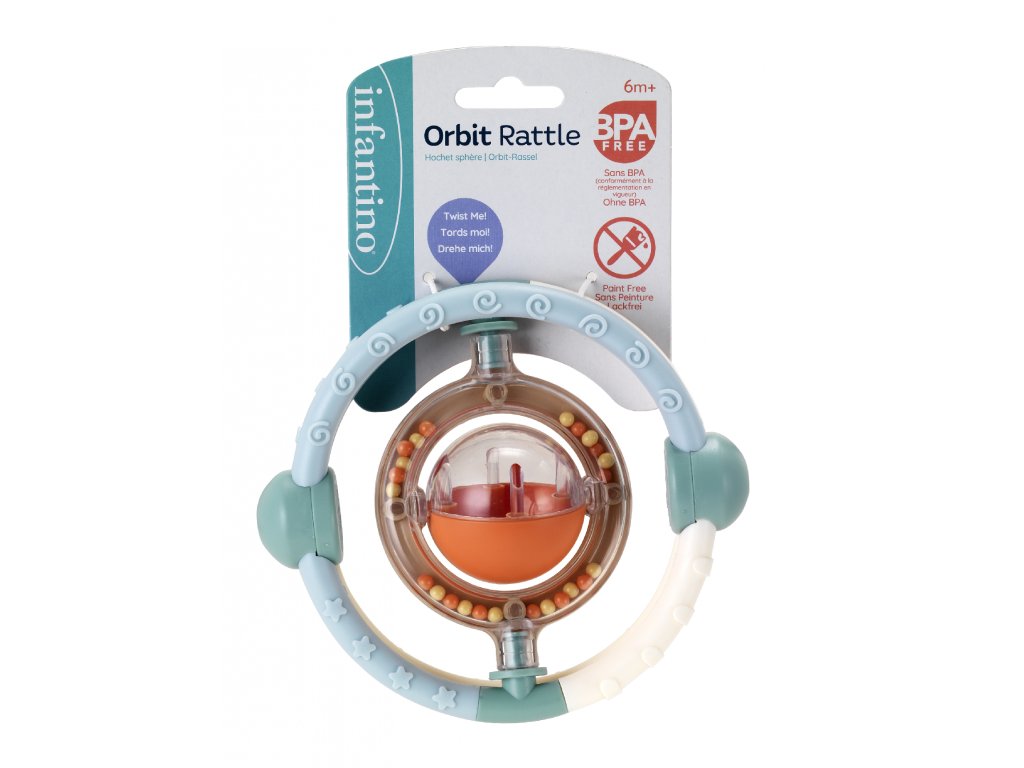 Chrastítko Infantino s různými texturami má tvar pro snadné uchopení a zkoumání ručičkami i v ústech. Korálky uvnitř průhledného kroužku při pohybu jemně chrastí. Chrastítko podporuje rozvoj jemné motoriky dítěte i jednotlivých smyslů. Vhodné pro děti od 6 měsíců.Doplňkové parametry