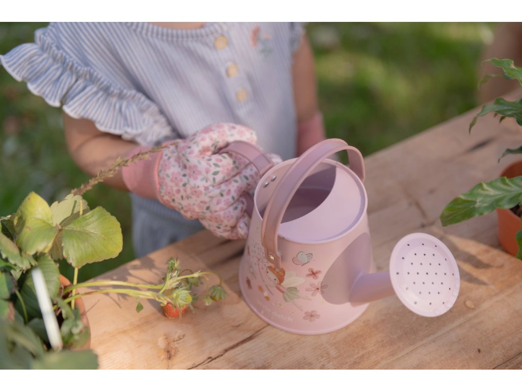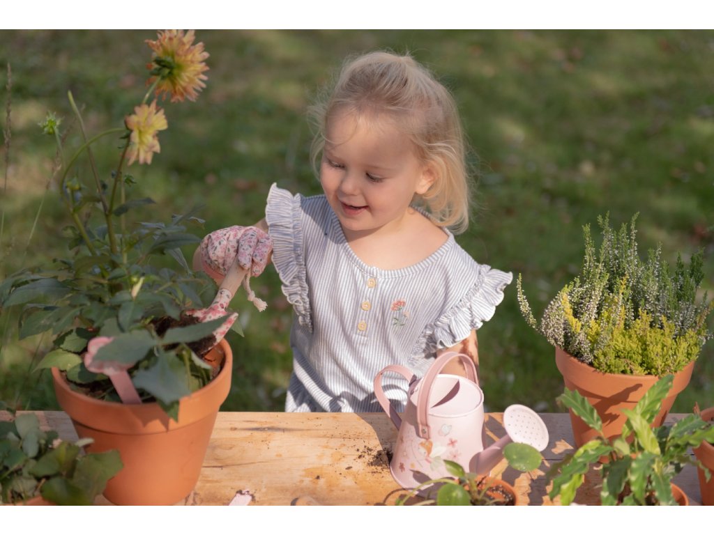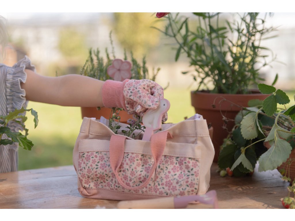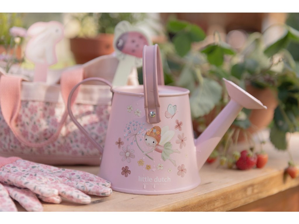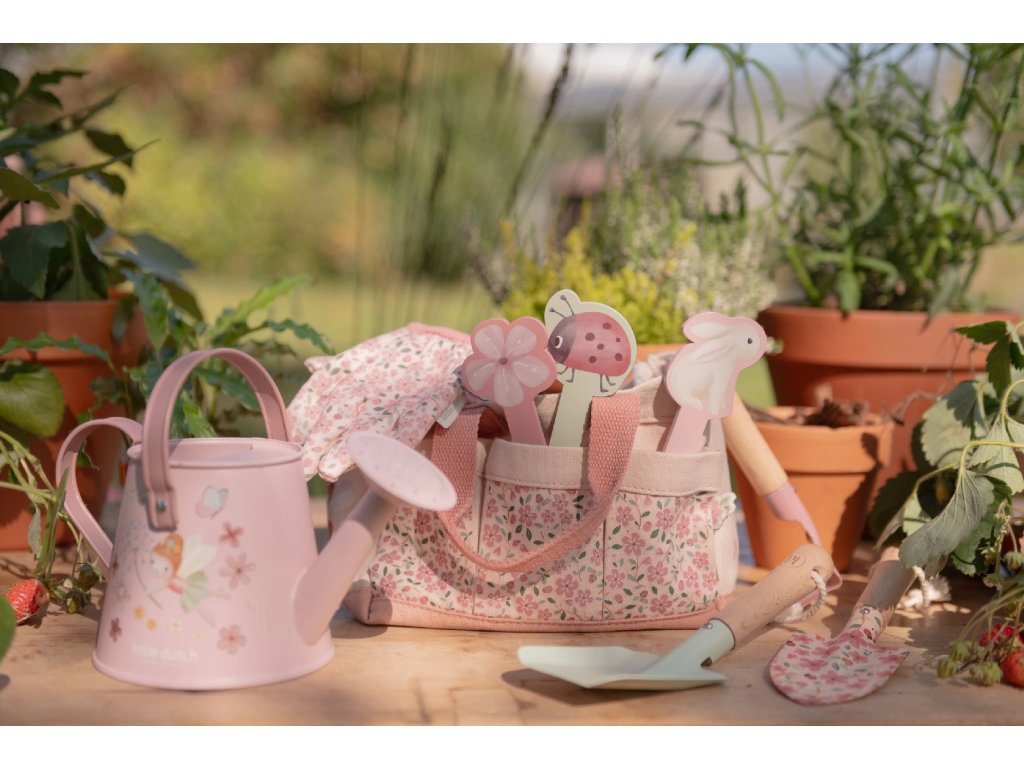 10-dílná sada nářadí v krásném provedení obsahuje vše, co malá zahradnice či zahradník potřebují: konvičku na zalévání, zahradnické rukavice, dvě lopatky a hrabičky v kvalitním provedení z odolného kovu s dřevěnou rukojetí a tři zapichovací dřevěné jmenovky. Vše je uloženo v praktické pevné tašce z bavlněného plátna s množstvím kapes pro přehledné ukládání a snadné přenášení. Nářadí i taška jsou zdobené krásným potiskem motivů ze života na zahradě. Sada je součástí designové kolekce hraček a doplňků Little Dutch Fairy Garden, inspirované životem na zahradě. Vhodné pro děti od 3 let.Doplňkové parametry