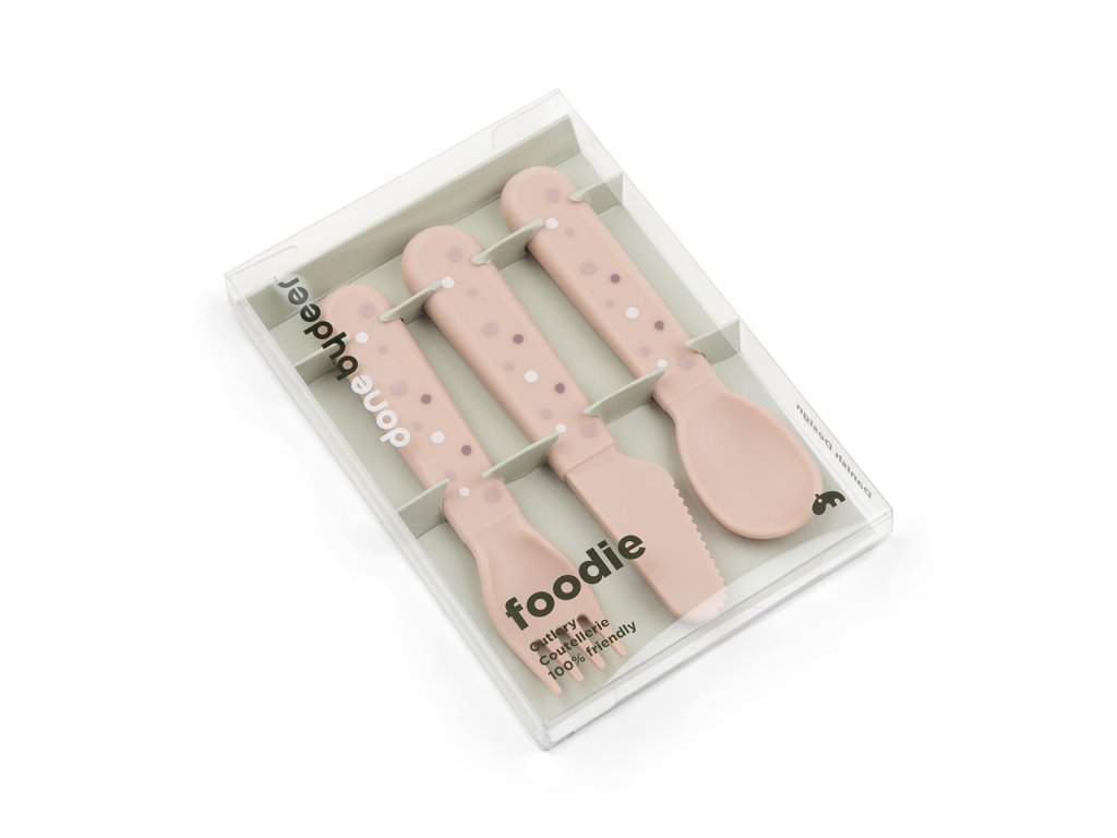 Materiál 100% potravinářský PP. Velikost 12 cm Péče Vhodné do myčky (max 70°C) a mikrovlnné trouby. Nepoužívejte v troubě. Sada příborů Foodie má měkké, zaoblené hrany, díky čemuž jsou bezpečné pro nejmenší, kteří si trénují jídlo sami. Příbory perfektně padnou do malých rukou a byly důkladně testovány dětmi. Roztomilá sada příborů pro miminka a batolata se skládá ze lžíce, vidličky a nože. Jakmile příbory doslouží svému účelu prostřednictvím bezpočtu rodinných večeří, lze je roztřídit jako plasty a recyklovat na nové produkty každodenního života. Krásná sada příborů pokrytá hravými tečkami rozzáří každé jídlo. Jeho hedvábně matný povrch ladí se zbytkem kolekce Foodie.Doplňkové parametry