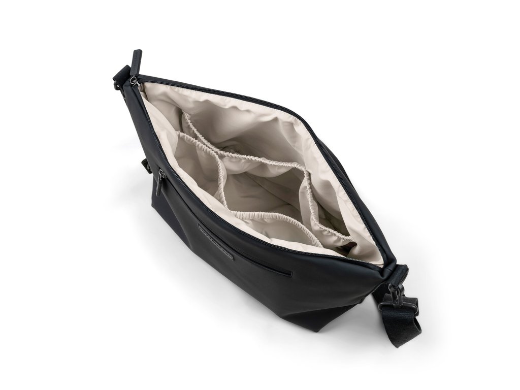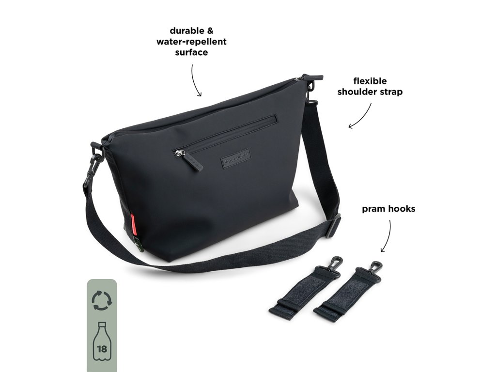 Tato černá taška na kočárek je praktický a stylový způsob, jak mít své nezbytnosti a nezbytnosti vašeho nejmenšího uspořádané a snadno dostupné. Bez námahy se připevňuje na madlo kočárku pomocí háčků na kočárek. Najdete zde prostornou hlavní přihrádku se čtyřmi vnitřními kapsami a jednou vnější kapsou. Díky svému odolnému vodoodpudivému povrchu je tato taška připravena na každodenní používání. Ať už míříte do parku nebo na nákupy, je to dokonalá kombinace stylu a funkčnosti, díky které budete vy i váš malý průzkumník vypadat skvěle a mít pořádek. Materiál: Tkanina: 100% recyklovaný polyester s PU zátěrem. Podšívka: 100% recyklovaný polyester. Rozměr: 44 x 14 x V 25 cm. Kapacita 10l. Péče: Čistěte vlhkým hadříkem. Používejte jemné mýdlo.Doplňkové parametry
