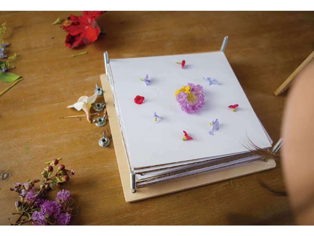 Dřevěný květinový lis s papírovými listy a kovovými šrouby v každém rohu, které pevně slisují stránky k sobě. Naplňte papírové stránky květinami a listy a stlačte je, abyste vytvořili jemné ploché sušené a konzervované květiny, připravené k použití při jakékoli výtvarné a řemeslné činnosti.