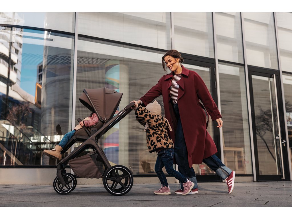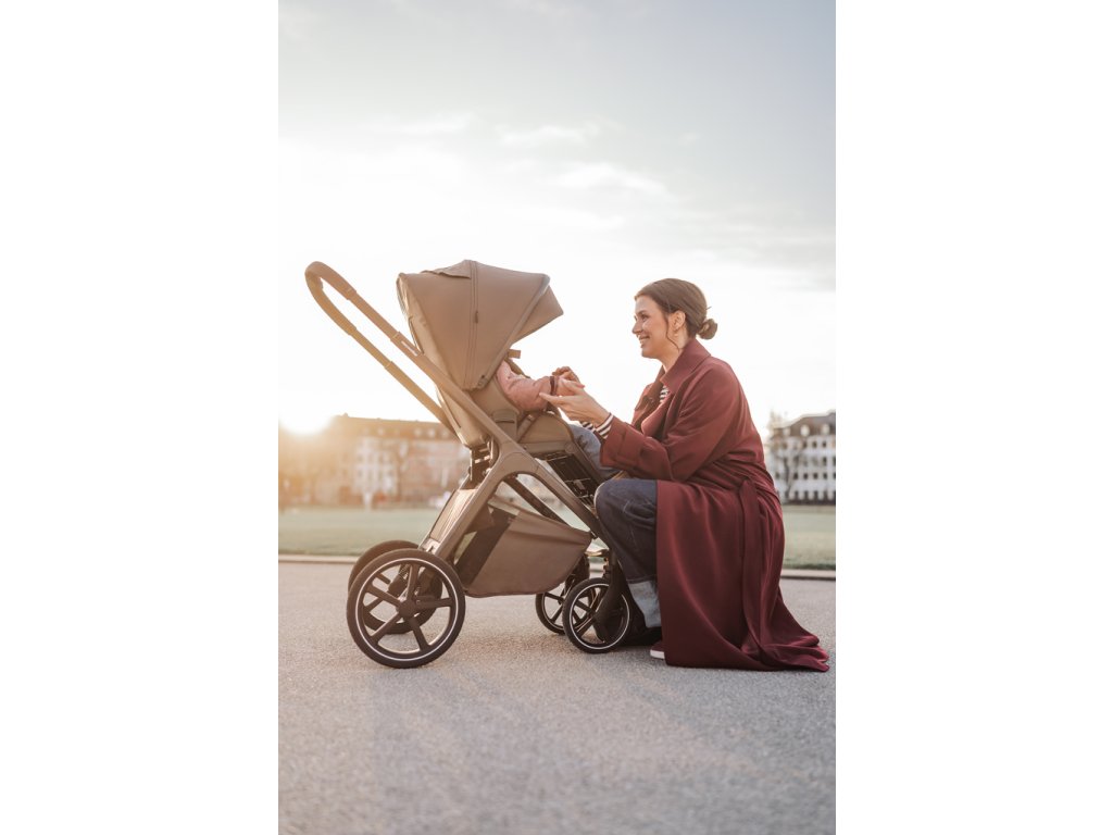 - Nastavitelná výška sedáku díky integrovanému výškovému adaptéru, možnost nastavení výšky na třech úrovních a korby na kočárku