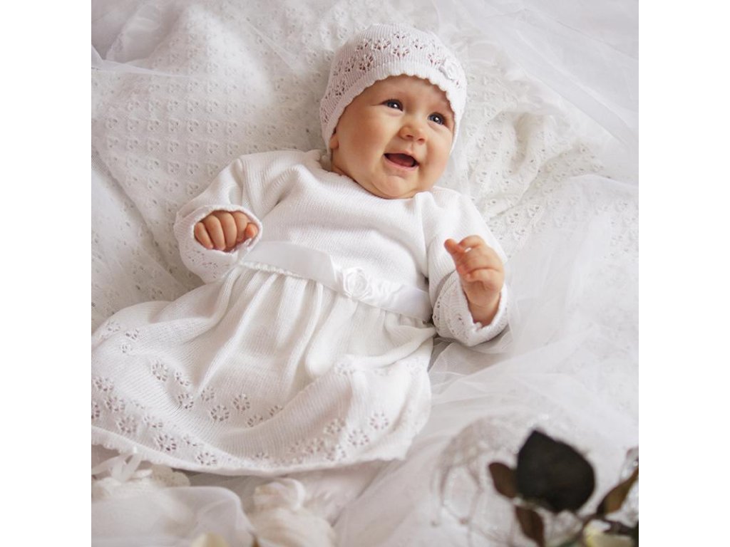 Souprava se skládá ze šatů a čepice, které jsou vyrobené z pleteniny s ozdobným ažurovým vzorem a ozdobnou stuhou.Složení: 65% Akryl, 35% bavlna