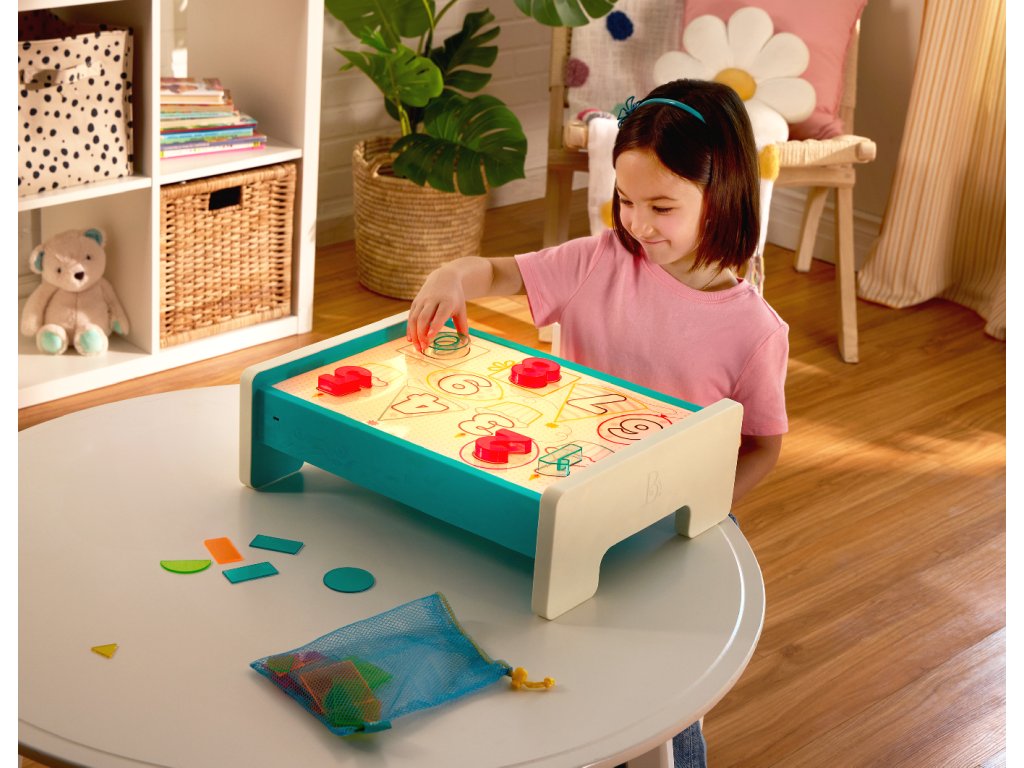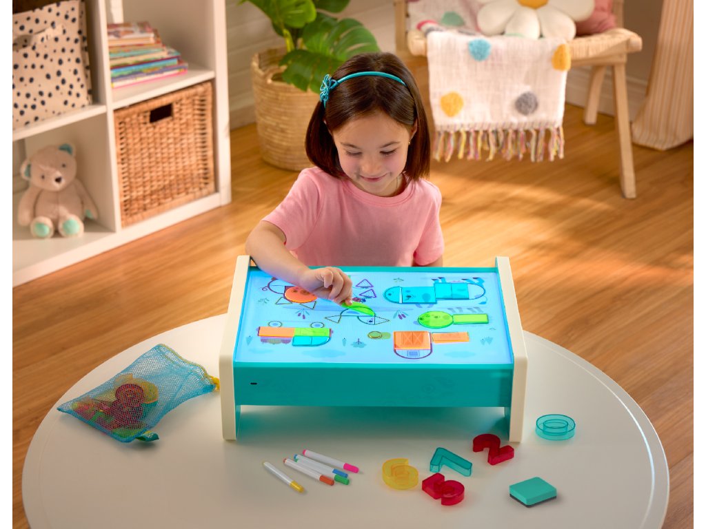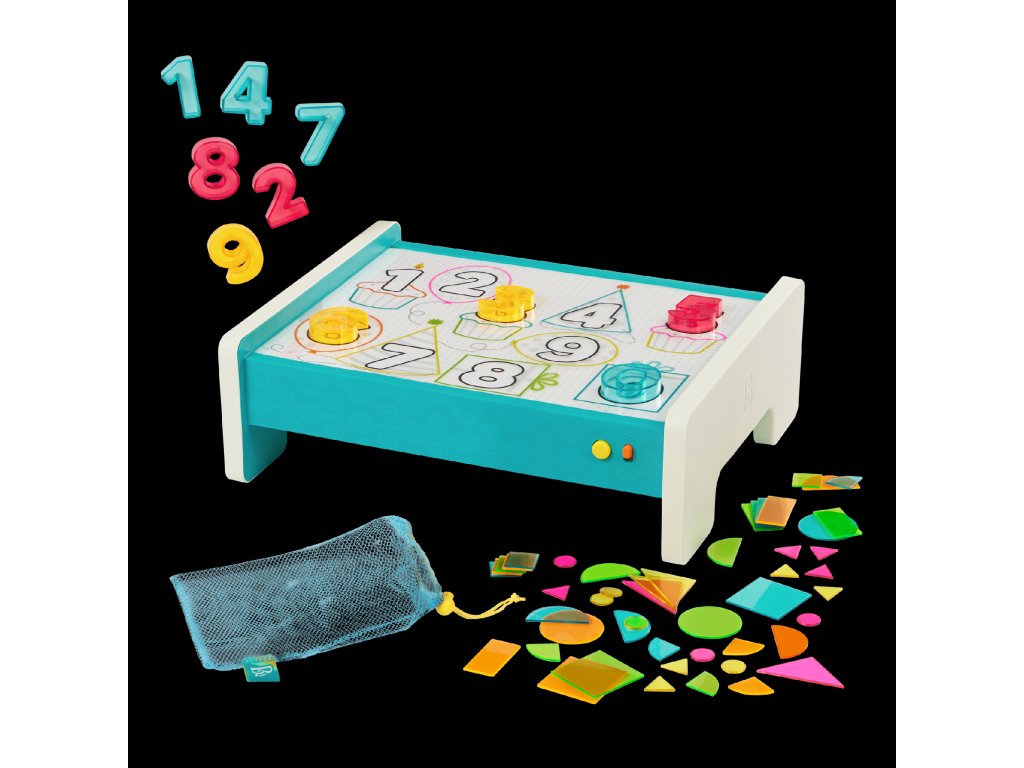 Interaktivní hrací pult Look & Shine nabízí dětem nekonečné možnosti pro kreativní hru, kreslení a učení. Zábavným způsobem podporuje přirozenou dětskou zvídavost a rozvíjí hravou formou jemnou motoriku, poznávání tvarů a čísel i kognitivní schopnosti. Svítící povrch pultu mění zmáčknutím tlačítka barvu. Obsah balení: hrací pult s barevným podsvícením 50 barevných tvarů 10 čísel 5 stíratelných fixů 1 stěrku 1 úložný sáček 3 průhledné šablony pro opakované obkreslování a vybarvování Pult nabízí dvě možnosti napájení: USB-C napájení z powerbanky (kabel ani powerbanka nejsou součástí) nebo baterie 6xAA (baterie nejsou součástí). Vhodné pro děti od 3 let.Doplňkové parametry