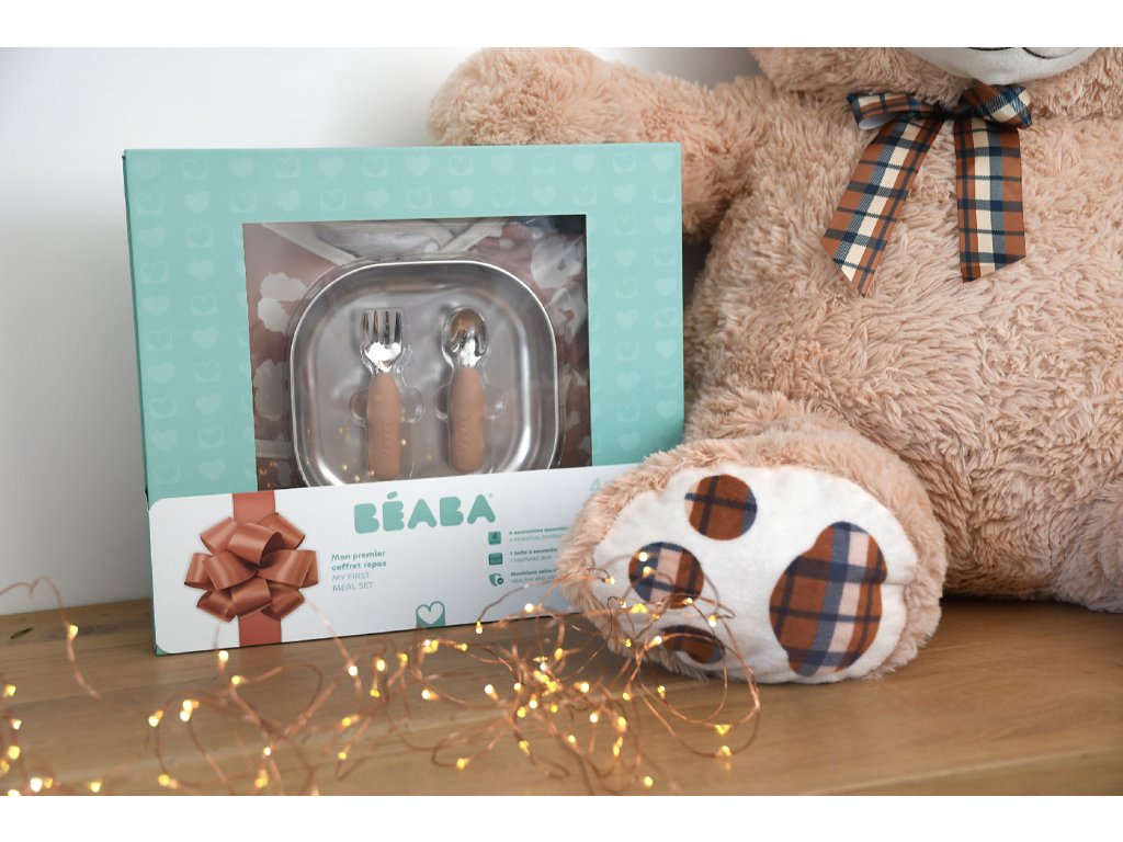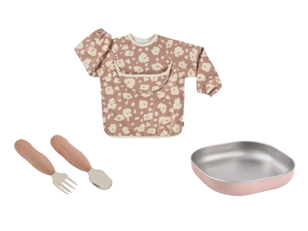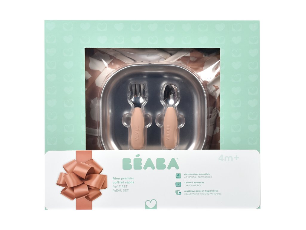 Jídelní sadu pro nejmenší tvoří nerezový talíř se silikonovou povrchovou vrstvou, ergonomická tréninková lžička a vidlička a bryndák s odepínacími rukávy a kapsou na drobky. Krásnou krabičku, ve které je sada zabalená můžete používat i jako krabičku na drobnosti. Ergonomický tvar talíře s vysokými stranami a zaoblenými rohy je ideální pro učení dětí samostatnému stolování. Silikonový povrch nádobí pomáhá, aby nádobí neklouzalo na stole ani v ruce. Nerezová ocel je odolný materiál bez chemikálií, který neovlivňuje chuť ani vůni pokrmu. Lžička a vidlička byly vyvinuty ve spolupráci se specialistou na dětské krmení. Krátká, zaoblená rukojeť sedí do malých ruček, mělká lžička pomáhá nabírat přiměřené množství a vidlička se zaoblenými hroty je zcela bezpečná. Kombinace silikonu a nerezu dělá z příboru dlouhodobého pomocníka pro rozvoj samostatnosti. Bryndák s odnímatelnými dlouhými rukávy chrání oblečení nejen při jídle, ale i při tvoření. Je nastavitelný (3 úrovně patentek), má elastické manžety a díky odepínacím rukávům ho snadno proměníte na variantu s krátkými rukávy. Nechybí skládací kapsa na zachytávání drobků a spadlého jídla. Omyvatelný lehký myteriál se snadno čistí. Talíř je vhodný do mikrovlnné trouby, talíř i příbory jsou vhodné do myčky. Vhodné pro děti od 4 měsíců.Doplňkové parametry