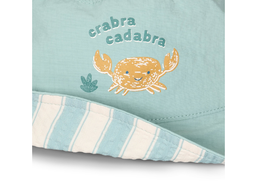 Oboustranný klobouček s krásným potiskem chrání vaše dítě před sluncem při koupání u moře i doma na zahradě. Ať už vaše děti milují skákání ve vlnách, koupání v bazénu nebo si rády staví hrady z písku, s touto čepičkou si mohou bezstarostně užívat celý den. Oboustranné provedení nabízí na výběr dva designy klouboučku - jednobarevný s potiskem a pruhovaný. Velikost 2 je určena pro děti cca od 1 roku do 2 let. Složení: 94% recyklovaný nylon, 6% spandex Při pobytu na slunci používejte pro dítě ochranné opalovací krémy. Možno prát v pračce na 30°C. Balení obsahuje 1 klobouček.Doplňkové parametry