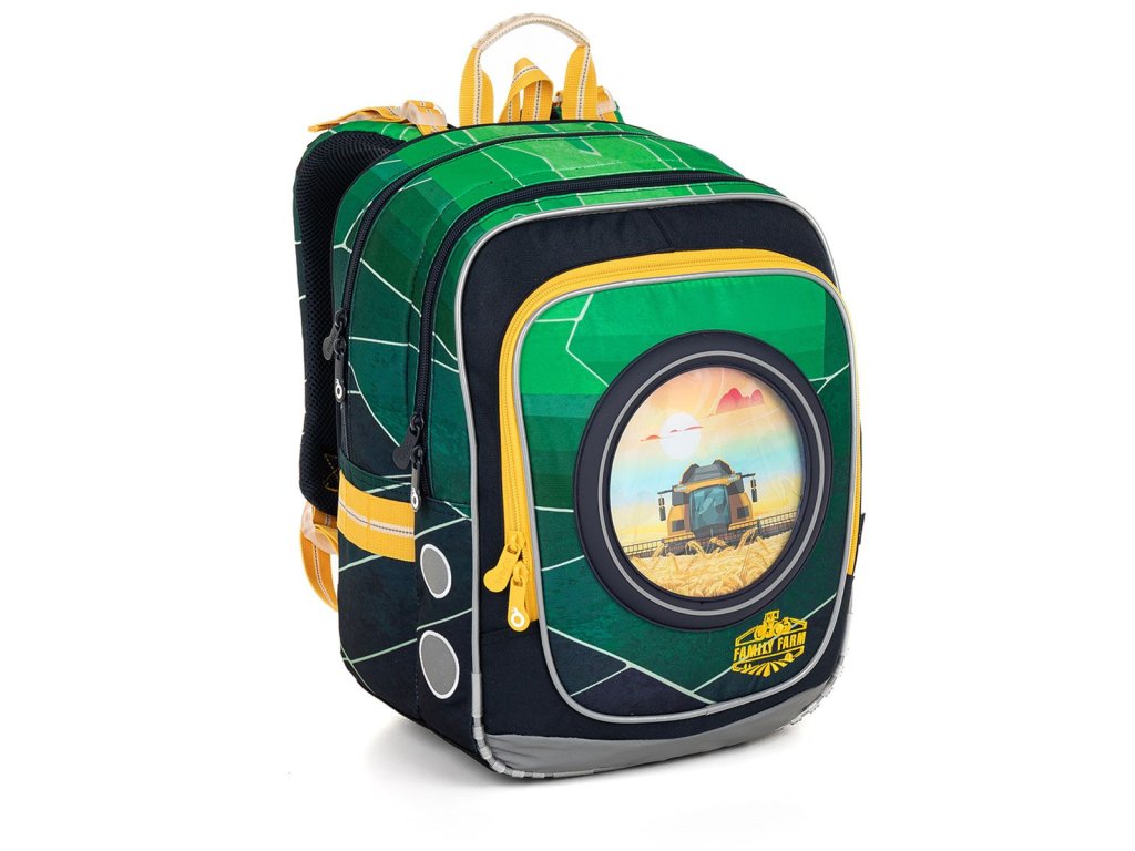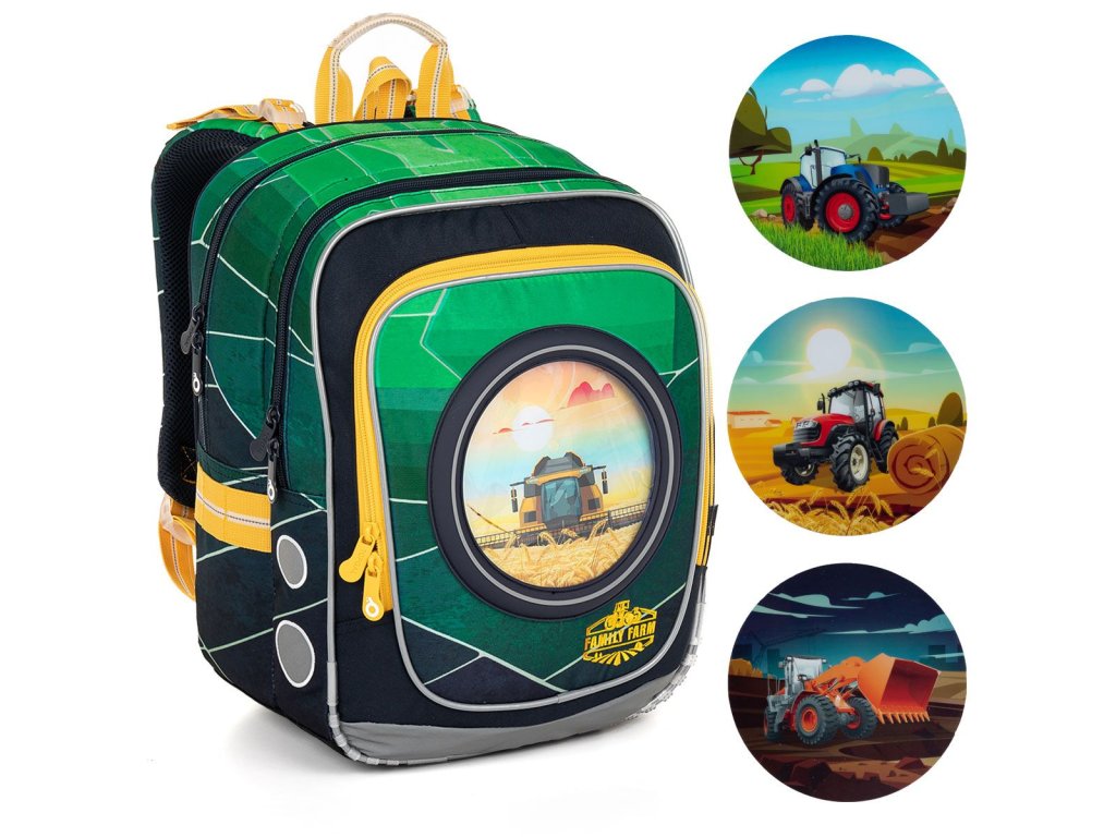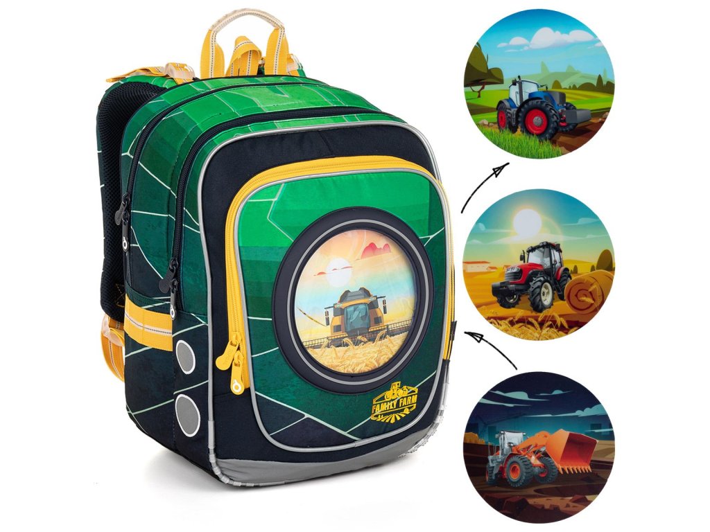 Model ENDY neváží ani kilogram, proto je ideální pro kluky od první až do třetí třídy ZŠ. Červený a modrý traktor, kombajn nebo bagr? Díky vyměnitelným obrázkům můžou mít každý den jiný batoh.
