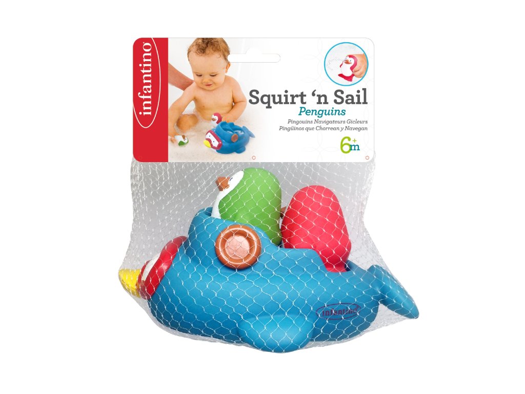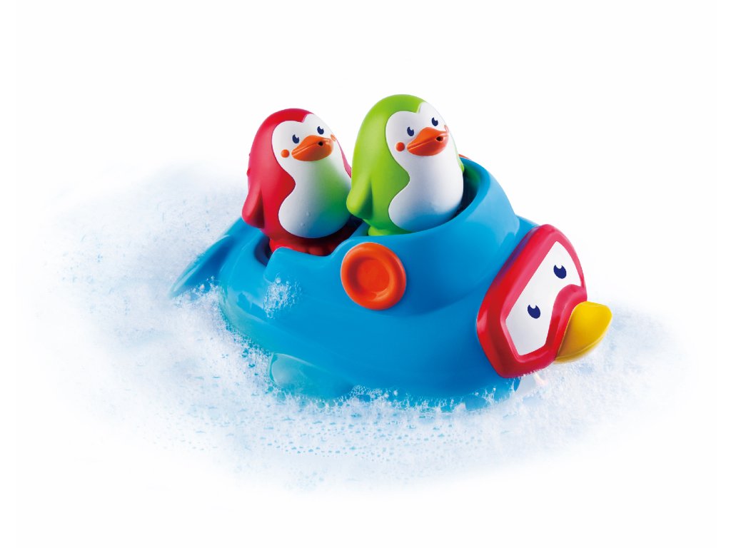 Lodička v podobě maxi tučňáka, který vozí dva malé stříkací tučňáky, je originální a zábavná hračka do koupele. Vymýšlejte spolu s dítětem během koupání příběhy o tom, co všechno tučňáci na svých výletech prožívají a užívejte si společně příjemné chvíle před spaním. Vhodné pro děti od 6 měsíců.Doplňkové parametry