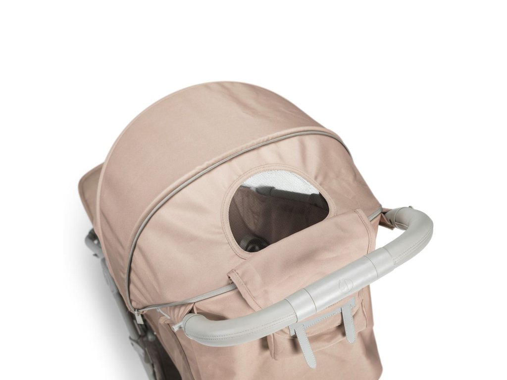 - Materiály: Stříška: 100% recyklovaný polyester s UV filtrem 50+ | Potah: 100% recyklovaný polyester | Madlo: veganská kůže