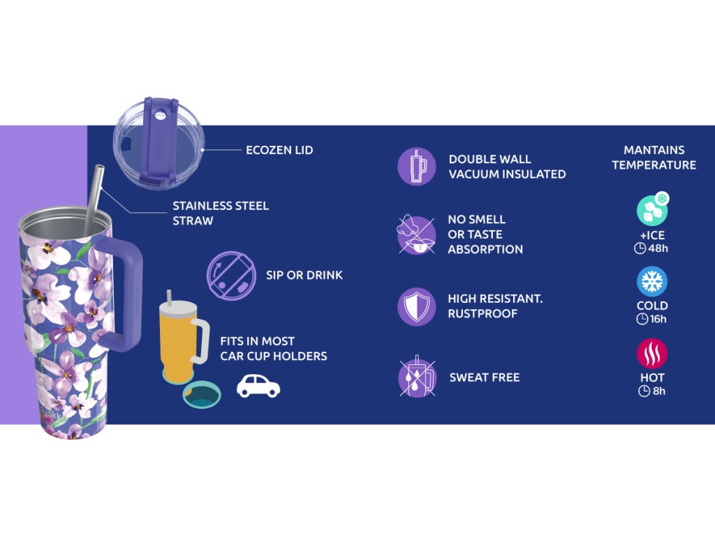 Termohrnek Quokka Stream z vysoce kvalitní dvoustěnné oceli udrží teplotu nápoje studeného s ledem až 48 hodin, studeného až 16 hodin a teplého až 8 hodin. Termohrnek s vyjímatelným nerezovým brčkem umožňuje snadné pití bez nutnosti naklánění. Spolehlivý uzávěr z kvalitního Ecozen plastu chrání obsah před vylitím a umožňuje z termohrnku pít i bez brčka. Široké hrdlo umožňuje vložení kostek ledu a zároveň se díky němu hrnek snadno čistí. Tvar termohrnku je vhodný do většiny držáků nápojů v autě. Objem: 1200 ml Rozměry: 320 x 100 mm Nerezový materiál neabsorbuje pachy a neobsahuje BPA. Termohrnek není vhodný do myčky ani mikrovlnné trouby.Doplňkové parametry
