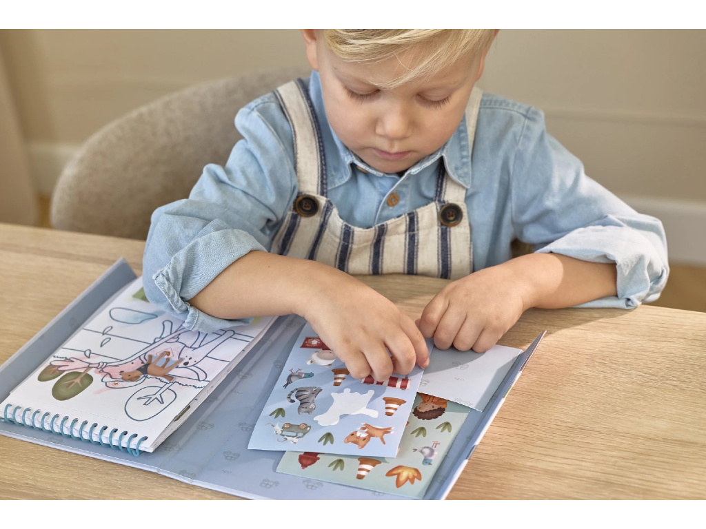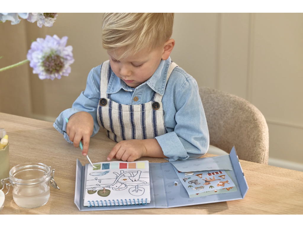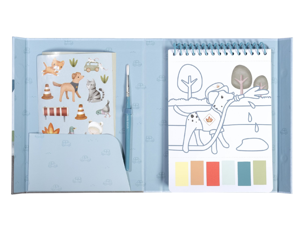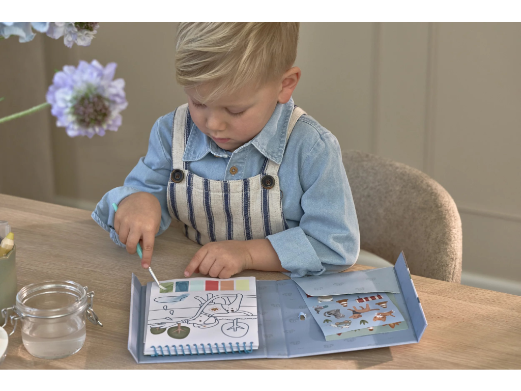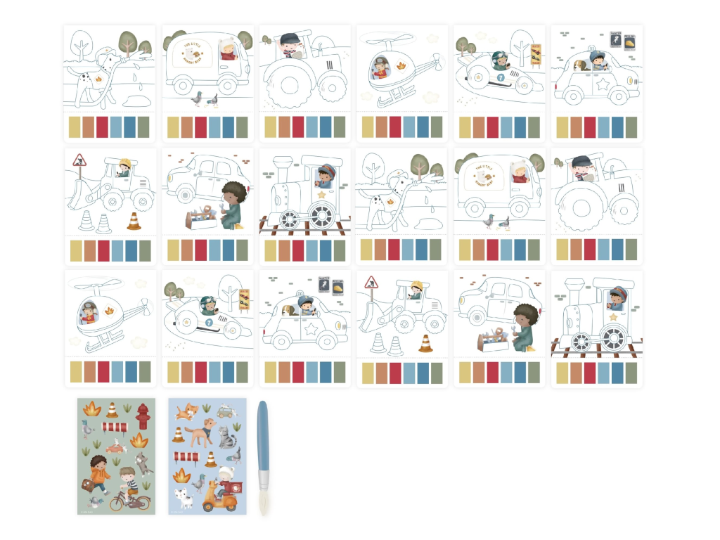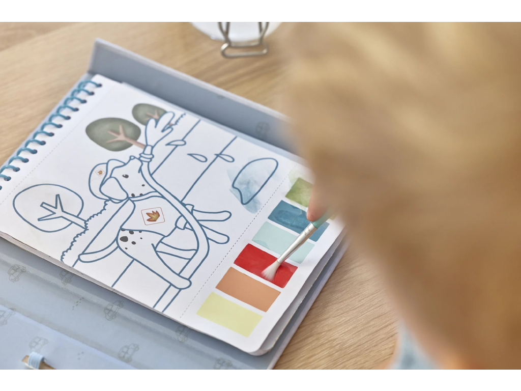 Krásné omalovánky na silném papíru obsahují 18 stránek s jednoduchými obrázky dopravních prostředků k vybarvování. Každá stránka nabízí vlastní paletu akvarelových barev pro vybarvování štětcem, takže použití je velmi jednoduché. Pro větší zábavu jsou součástí i dva archy krásných barevných samolepek pro dotvoření obrázků. Díky pevnému obalu s magnetickým zapínáním a poutkem na štětec je vše úhledně pohromadě. Spirála ve hřbetu umožňuje snadné otáčení stránek omalovánek. Omalovánky nabízí skvělý způsob, jak rozvíjet jemnou motoriku i představivost dítěte. Vhodné pro děti od 3 let.Doplňkové parametry