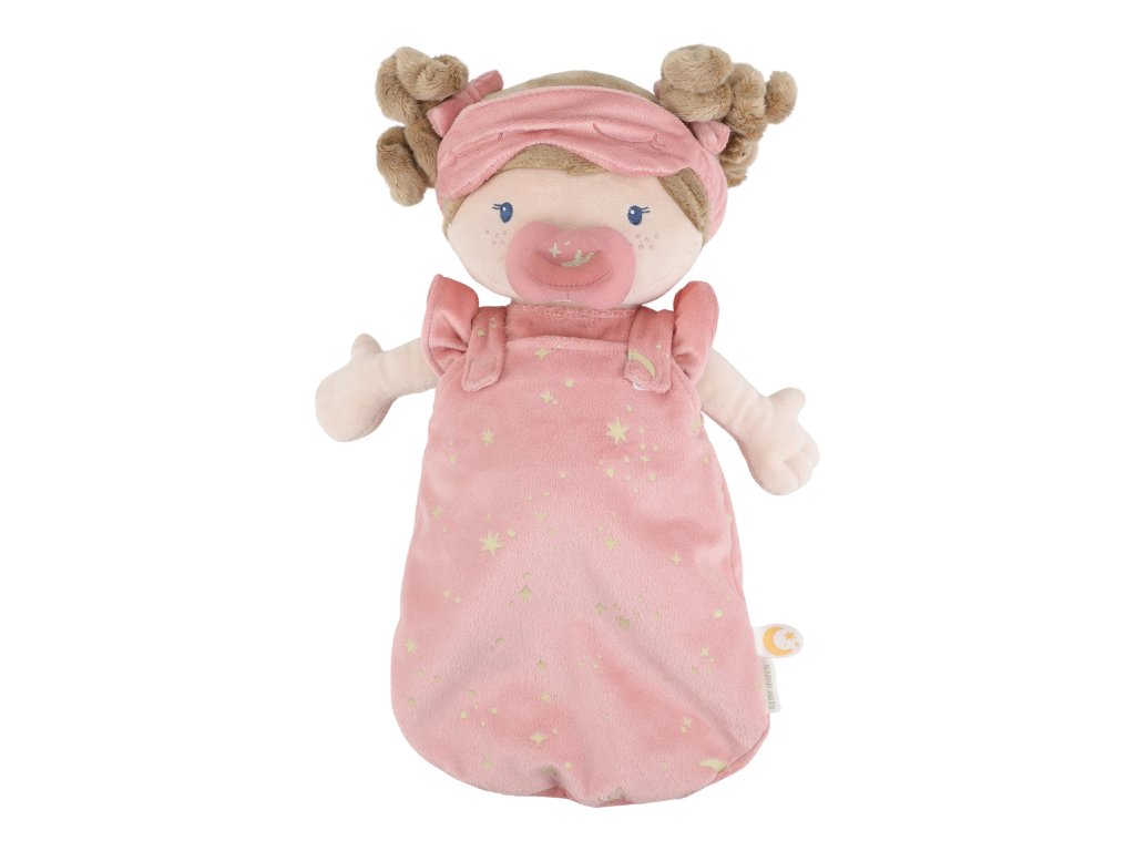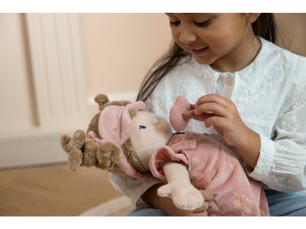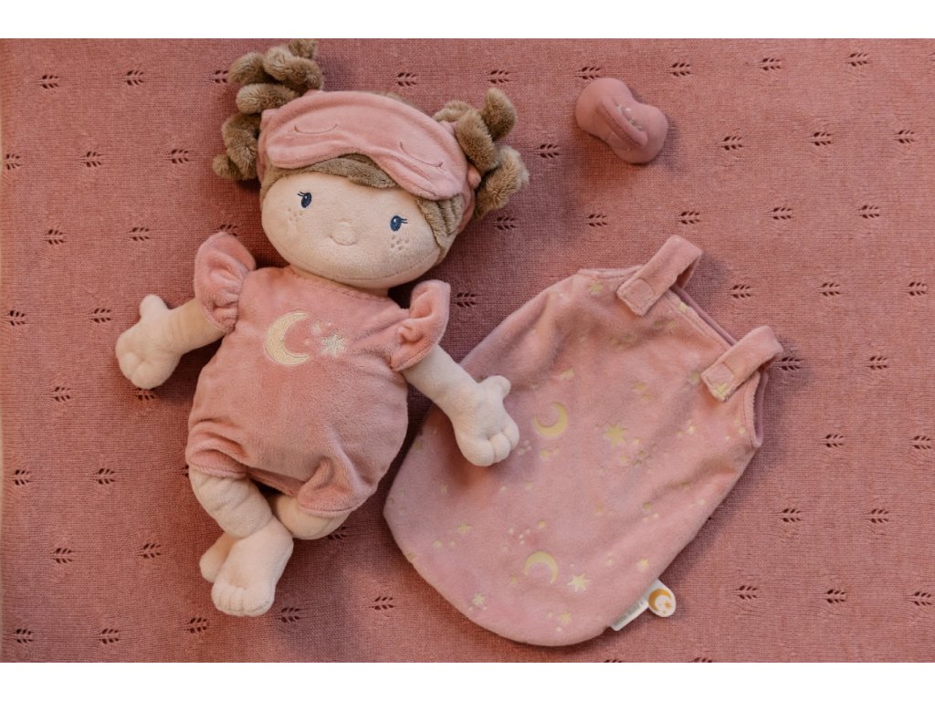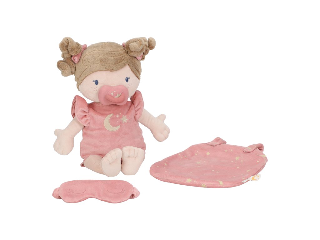 Něžná plyšová panenka Rosa z měkkého jemného materiálu je připravena na spaní, oblečena do pyžámka, vybavená plínkou, spacím pytlem, šidítkem i clonou na oči. Je vhodná na hraní i mazlení a bude se s ní i krásně usínat!