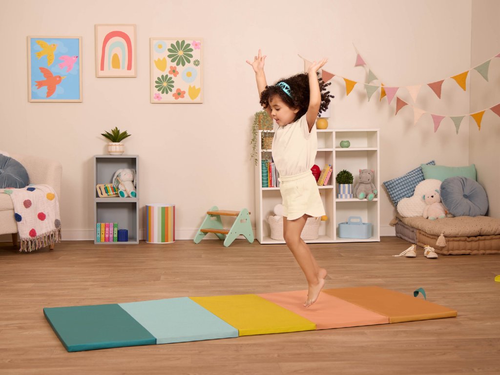 Barevná skládací podložka WonderTumble je ideální pro všechny aktivní děti, které se rády hýbou i doma. Podložka je tvořená pěti měkkými pěnovými panely, které se snadno rozloží do prostorné podložky na skákání, cvičení, tancování apod. Jemný měkký povrch tlumí dopady a podporuje bezpečnější pohyb při hraní. Kromě zábavy pomáhá podložka rozvíjet hrubou motoriku a motivuje děti k přirozenému pohybu. Po skončení hraní ji jednoduše složíte, přenesete pomocí praktického držadla a pohodlně uložíte – doma i na cestách. pěnová podložka na cvičení a aktivní hru v interiéru 5 skládacích pěnových panelů – měkké a pohodlné vhodná na skákání, kotouly, tanec i relax skládací a přenosná, s držadlem pro snadné přenášení podporuje pohyb, rozvoj hrubé motoriky a aktivní hru Rozměry: 175 x 72 x 2,5 cm Vhodné pro děti od 3 let.Doplňkové parametry
