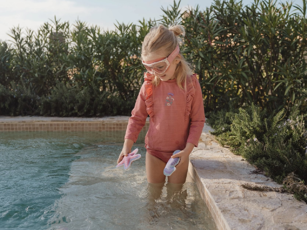 Plavky z UV ochranné tkaniny s krásnou výšivkou chrání vaše dítě před sluncem při koupání u moře i doma na zahradě. Ať už vaše děti milují skákání ve vlnách, koupání v bazénu nebo si rády staví hrady z písku, v těchto plavkách si mohou bezstarostně užívat celý den. Složení: 77% recyklovaný nylon, 9% polyester, 6% kovové vlákno, 8% elastan Ochranný faktor: UPF 40+ Při pobytu na slunci používejte pro dítě ochranné opalovací krémy. Možno prát v pračce na 30°C. Po každém použití plavky propláchněte v čisté studené vodě.Doplňkové parametry