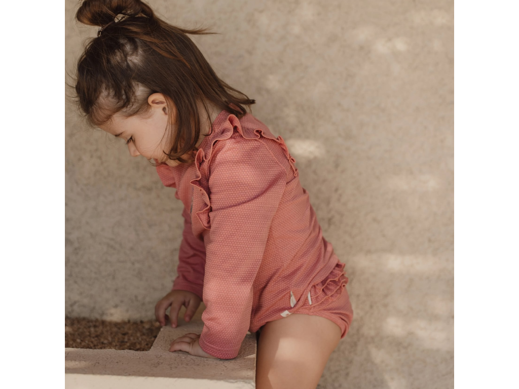 Plavky s krásnou výšivkou chrání vaše dítě před sluncem při koupání u moře i doma na zahradě. Ať už vaše děti milují skákání ve vlnách, koupání v bazénu nebo si rády staví hrady z písku, v těchto plavkách si mohou bezstarostně užívat celý den. Složení: 77% recyklovaný nylon, 9% polyester, 6% kovové vlákno, 8% elastan Při pobytu na slunci používejte pro dítě ochranné opalovací krémy. Možno prát v pračce na 30°C. Po každém použití plavky propláchněte v čisté studené vodě.Doplňkové parametry