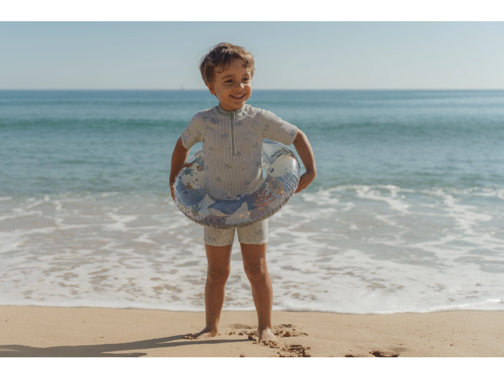 Plavky s krásným potiskem chrání vaše dítě před sluncem při koupání u moře i doma na zahradě. Ať už vaše děti milují skákání ve vlnách, koupání v bazénu nebo si rády staví hrady z písku, v těchto plavkách si mohou bezstarostně užívat celý den. Složení: 94% recyklovaný nylon, 6% spandex Při pobytu na slunci používejte pro dítě ochranné opalovací krémy. Možno prát v pračce na 30°C. Po každém použití plavky propláchněte v čisté studené vodě.Doplňkové parametry