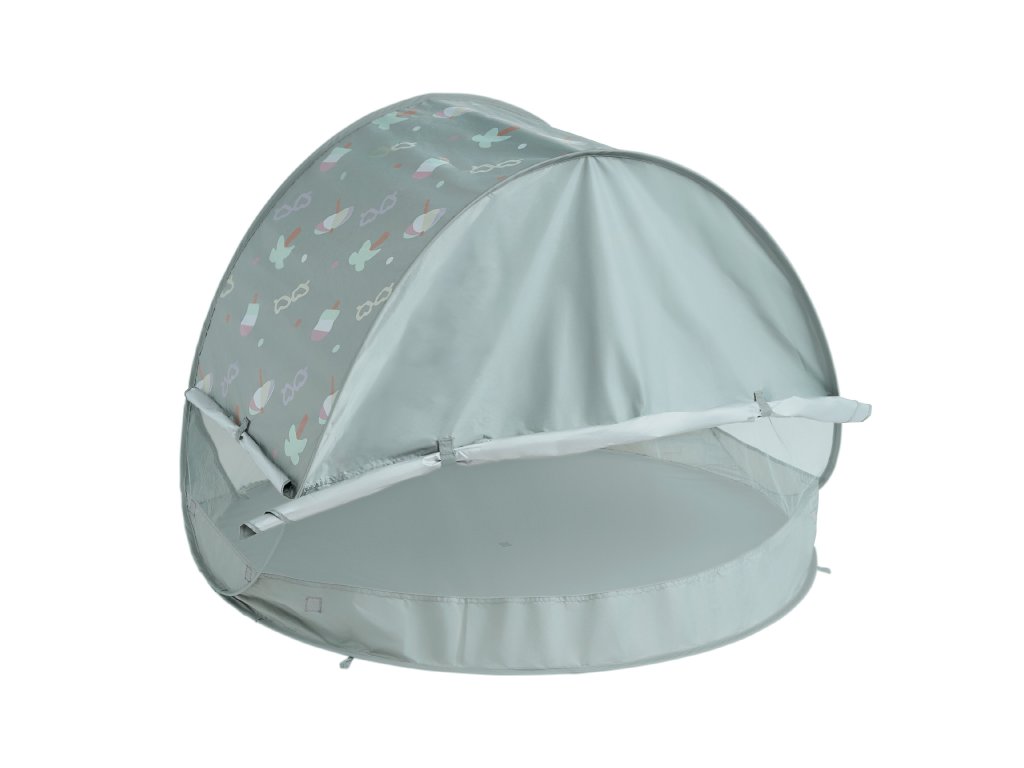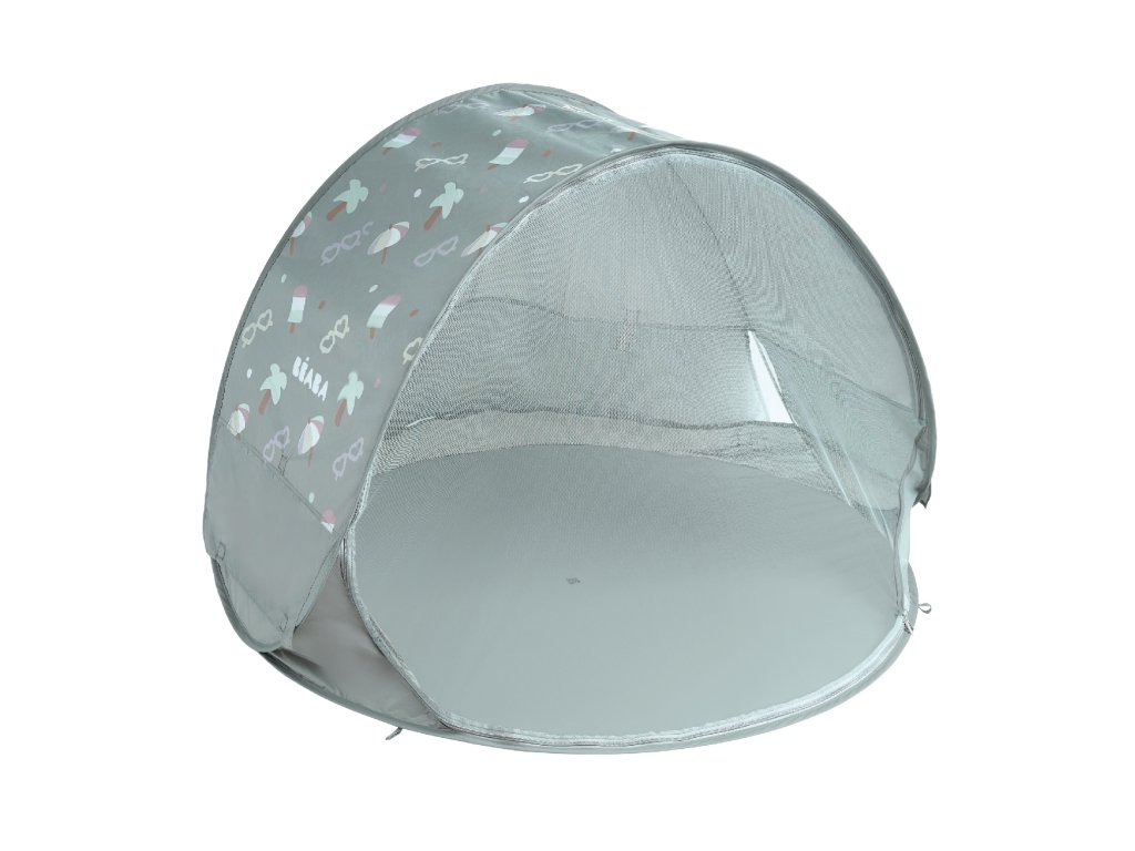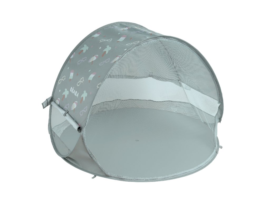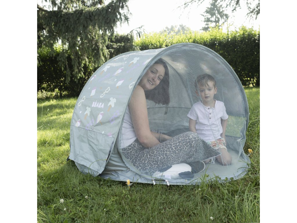 Přenosný univerzální stan s UV faktorem 50+ pro ochranu dítěte před sluncem na zahradě, na pláži či na výletech do přírody. Stan umožňuje snadnou ventilaci díky bočním otvorům se síťovinou a textilními chlopněmi, které je možné srolovat. Síťovina chrání dítě ve stanu před obtížným hmyzem. Stan nabízí prostor pro jednoho dospělého a jedno dítě nebo pro více dětí. Stan s vyskakovacím systémem velmi snadno složíte i rozložíte. Po složení do přenosné tašky o průměru 60 cm jej vezmete s sebou kamkoli potřebujete. Rozměry: průměr 120 cm, výška 85 cm Příslušenství: taška na přenášení s popruhem přes rameno, 4 kolíky pro uchycení stanu. Složení: 100% polyester (bez PFAS)Doplňkové parametry