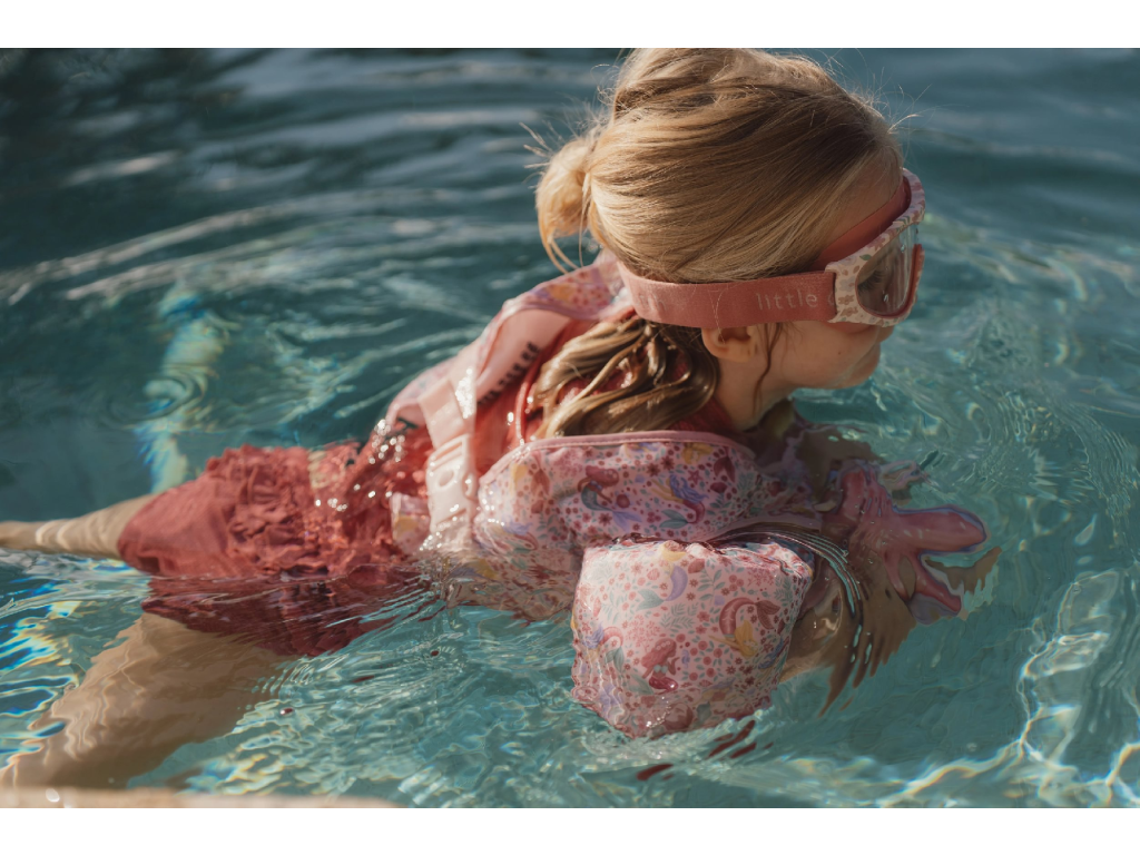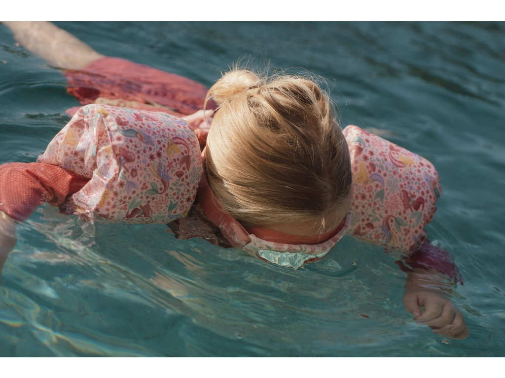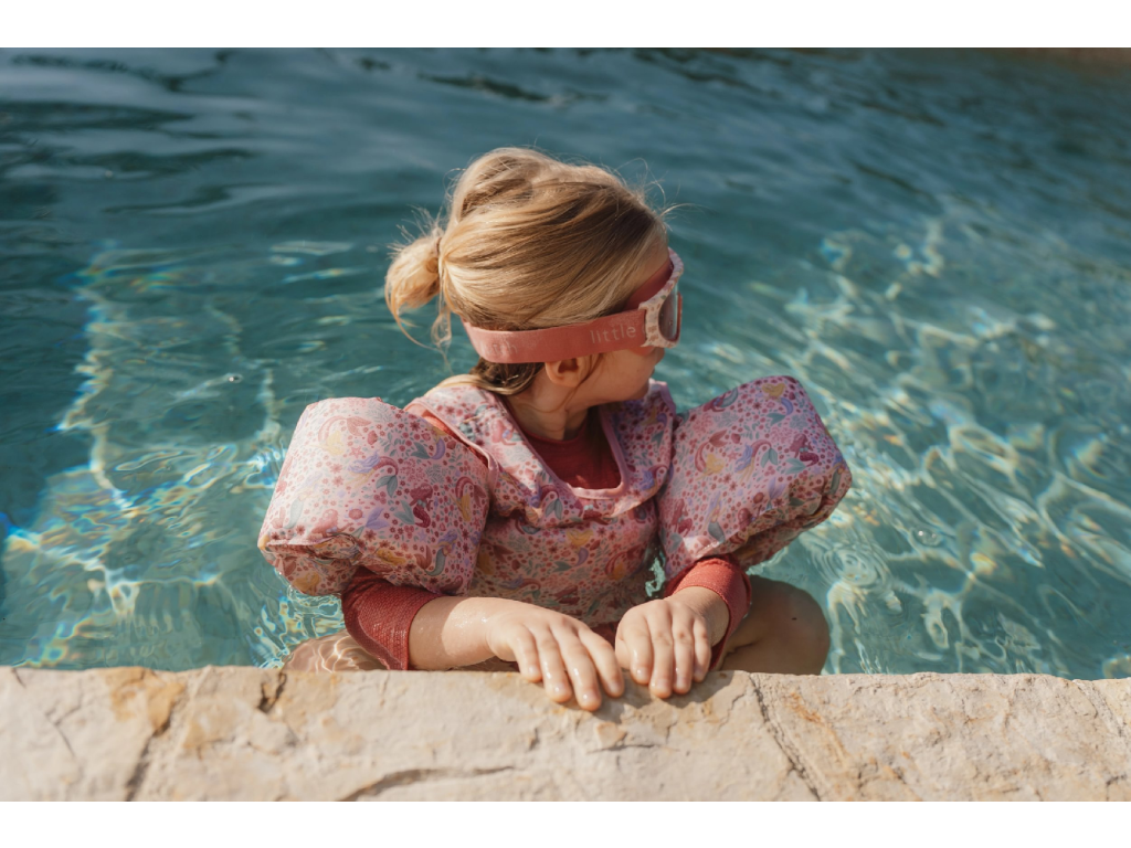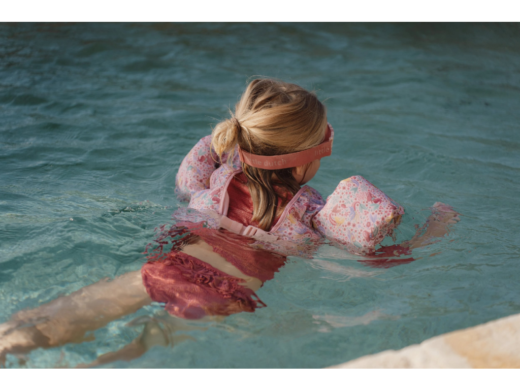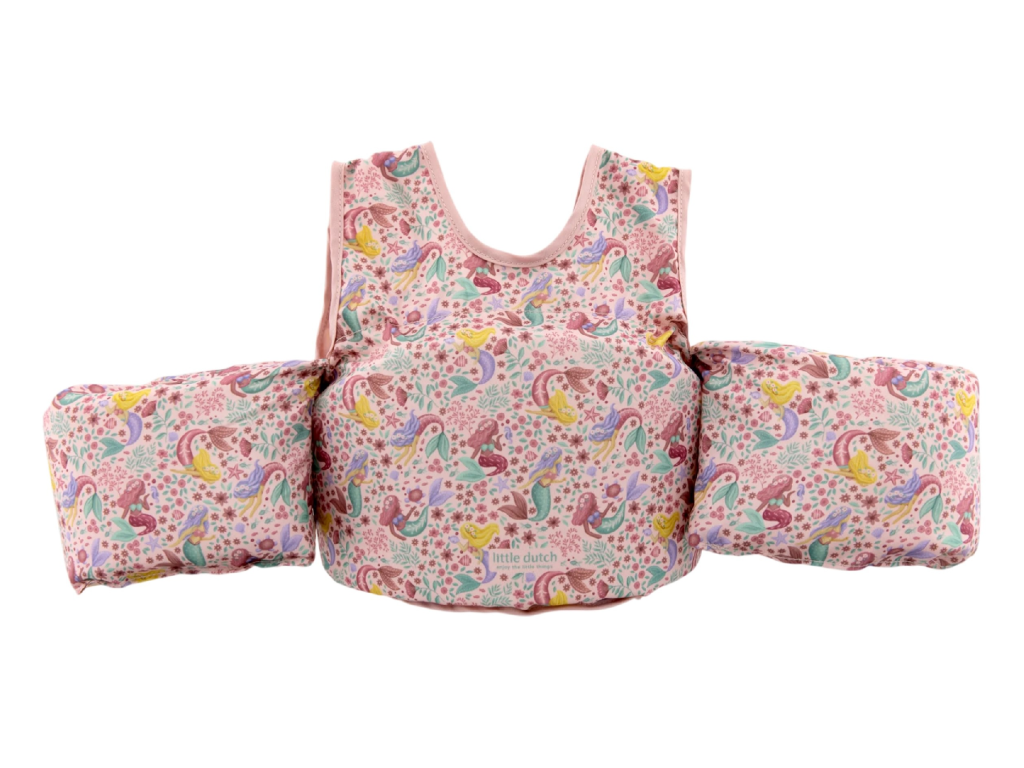 Kombinace plovací vesty a rukávků pomůže vašemu dítěti získat jistotu při plaveckých začátcích a zároveň mu zajistí optimální volnost pohybu. Díky nastavitelné přezce vestu snadno přizpůsobíte velikosti dítěte. Měkký a odolný polyester je příjemný na kůži a je ideální pro dlouhodobé nošení ve vodě i v jejím okolí. Vesta s krásným potiskem mořské víly a květin je součástí designové kolekce Little Dutch Dreamy Mermaid. Vhodné pro děti od 3 do 6 let (od 15 do 30 kg).Doplňkové parametry