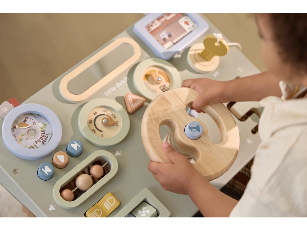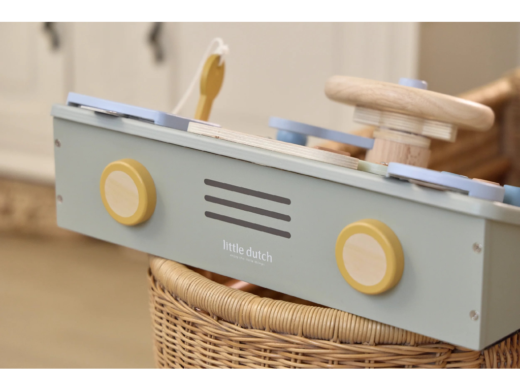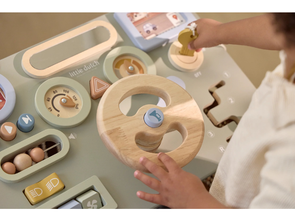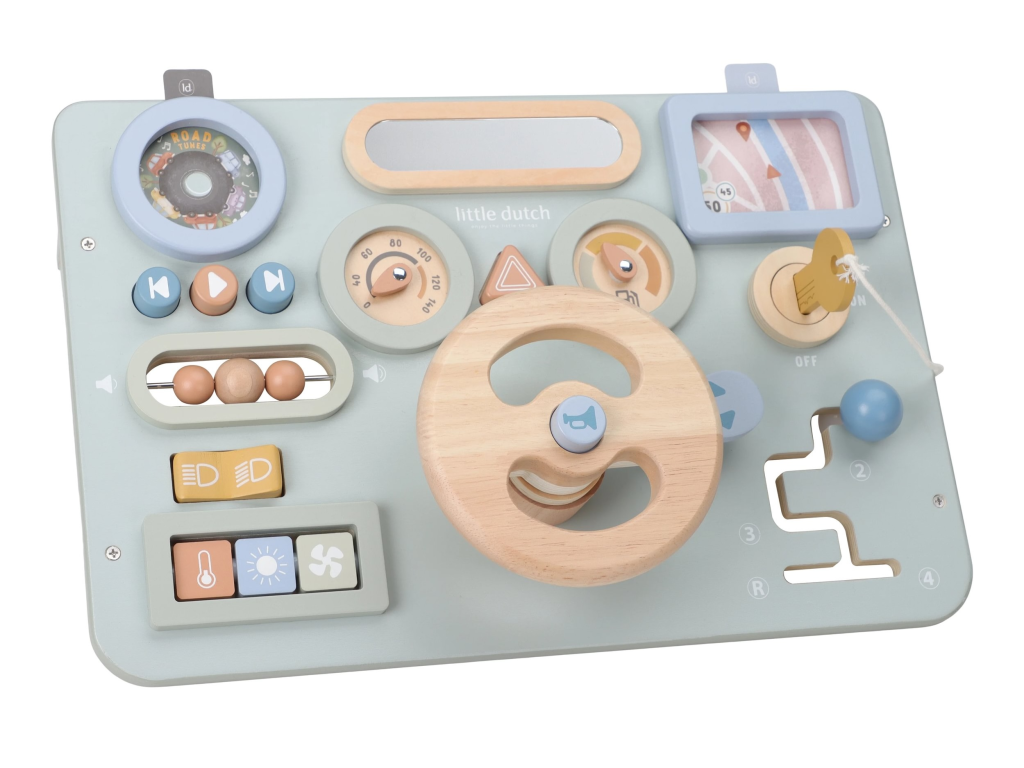 Dřevěný hrací pult s volantem láká děti na vlastní dobrodružnou jízdu. Dítě může otáčet volantem, mačkat tlačítka a objevovat veselé zvuky, které podporují aktivní a nápaditou hru. Součástí jsou také kartičky, díky kterým si dítě může „naplánovat trasu“ a vymýšlet vlastní příběhy. Pult je vyrobený z pevného dřeva v jemných pastelových barvách, takže se stane i krásným doplňkem dětského pokoje a dobře se kombinuje s dalšími dřevěnými hračkami. Hračka je součástí kolekce vysoce kvalitních dřevěných hraček Little Dutch, navržených s důrazem na bezpečnost a originální design. Vyrobeno z odolného FSC certifikovaného dřeva. Rozměry: 45 x 29 x 12,7 cm Vhodné pro děti od 12 měsíců.Doplňkové parametry