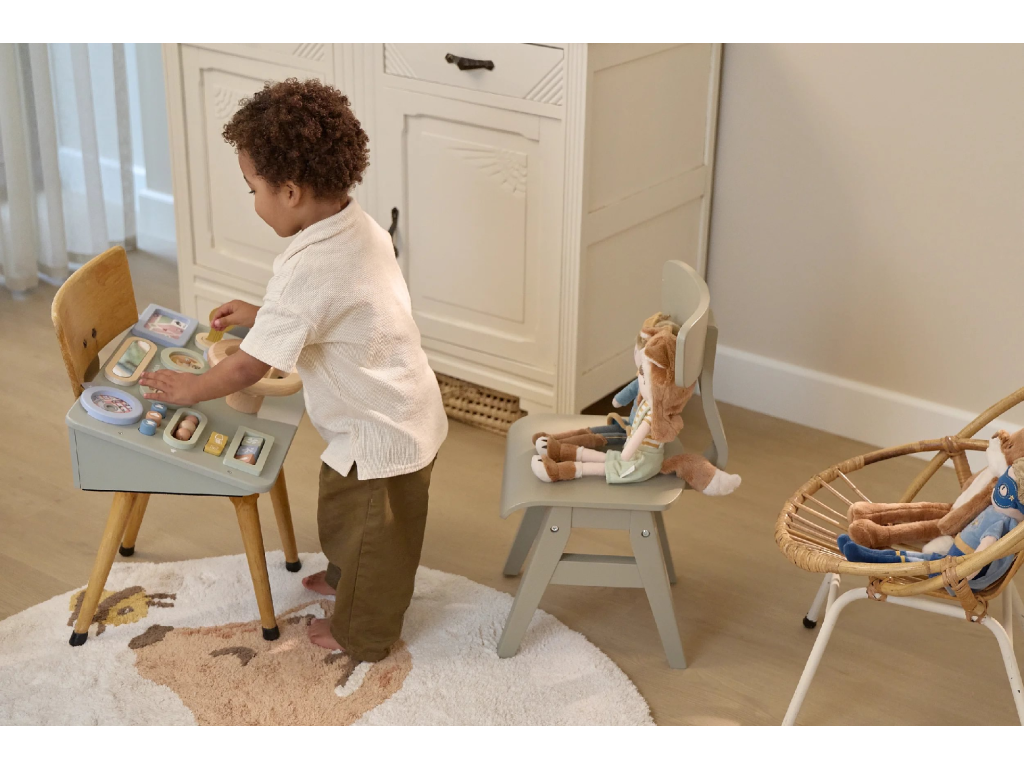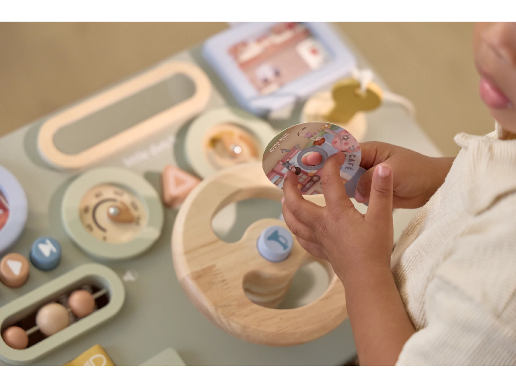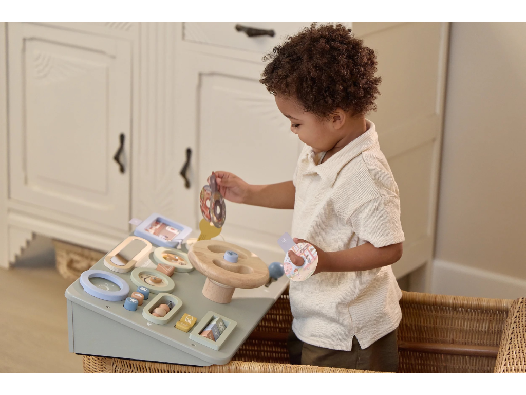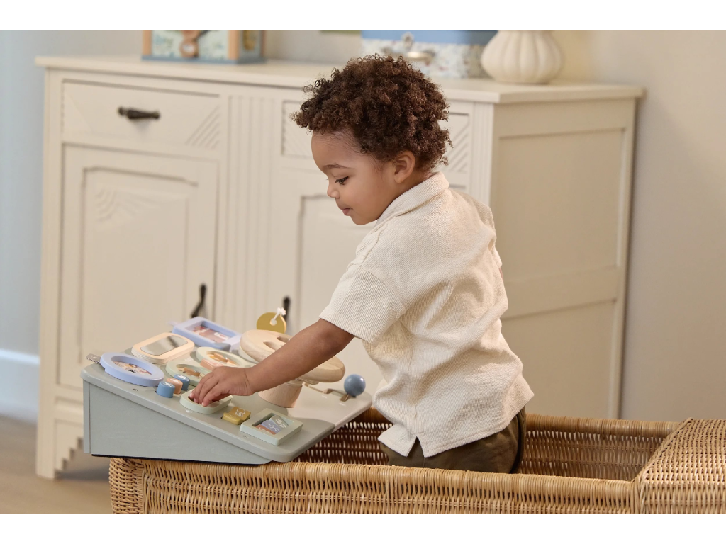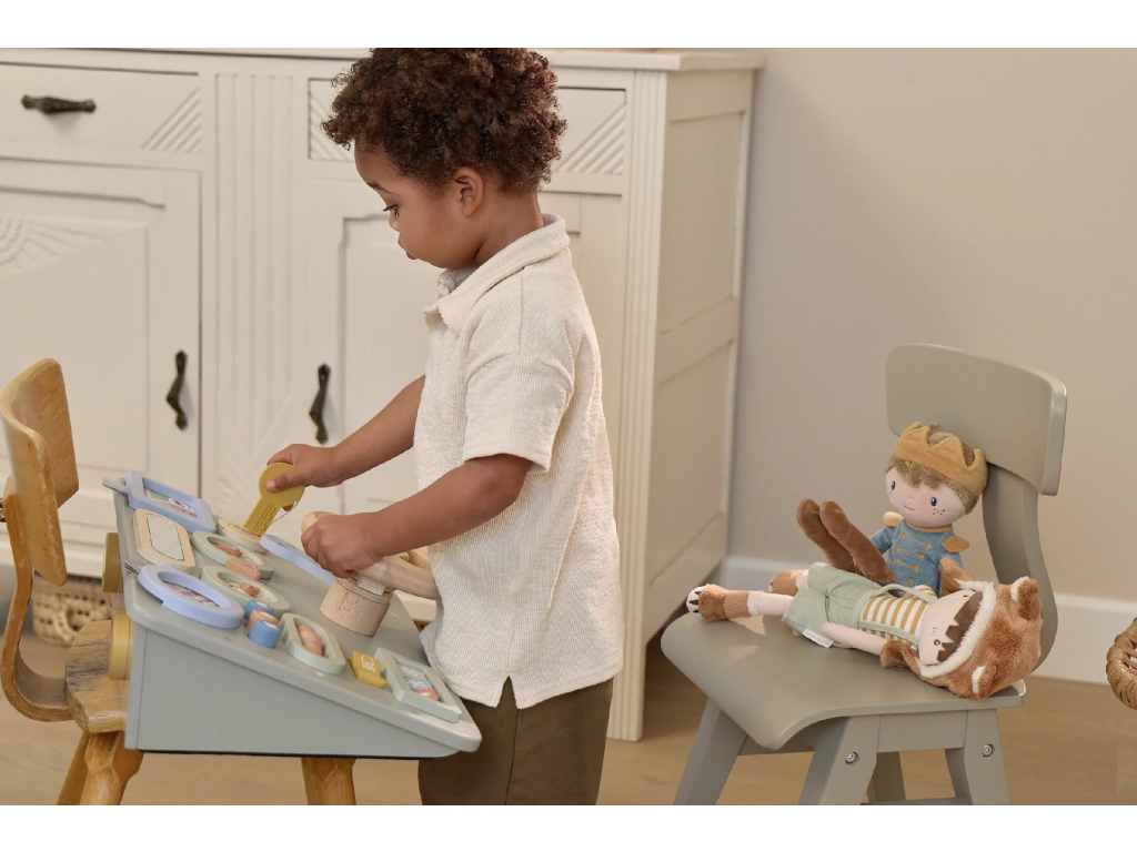 Dřevěný hrací pult s volantem láká děti na vlastní dobrodružnou jízdu. Dítě může otáčet volantem, mačkat tlačítka a objevovat veselé zvuky, které podporují aktivní a nápaditou hru. Součástí jsou také kartičky, díky kterým si dítě může „naplánovat trasu“ a vymýšlet vlastní příběhy. Pult je vyrobený z pevného dřeva v jemných pastelových barvách, takže se stane i krásným doplňkem dětského pokoje a dobře se kombinuje s dalšími dřevěnými hračkami. Hračka je součástí kolekce vysoce kvalitních dřevěných hraček Little Dutch, navržených s důrazem na bezpečnost a originální design. Vyrobeno z odolného FSC certifikovaného dřeva. Rozměry: 45 x 29 x 12,7 cm Vhodné pro děti od 12 měsíců.Doplňkové parametry