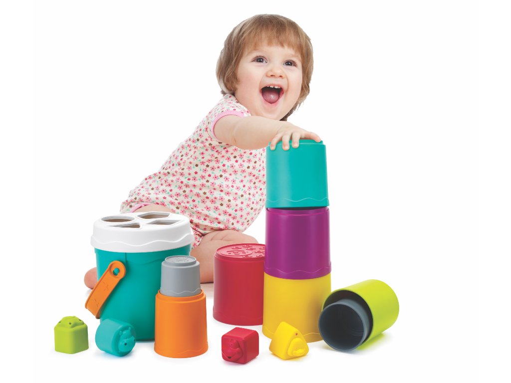 22-dílná sada hraček, která vaše dítě zabaví na dlouhé hodiny a zároveň zábavnou formou pomáhat rozvíjet motorické dovednosti, jednotlivé smysly i koordinaci ruka / oko dítěte. Sada obsahuje: Hrací pult s rotujícími míčky - pultík je naplněný různobarevnými míčky, které po zmáčknutí páky v horní části rotují kolem dokola. Jednoduchá, ale neodolatelná zábava! Stohovací kelímky v kyblíku - osm barevných stohovacích kelímků, které můžete stavět až do výšky 70 cm nebo naopak vkládat do sebe + kyblík s víkem, ve kterém jsou otvory čtyř různých tvarů, do nich pasují čtyři barevné kostky. Stohovací kelímky spolu s kostkami snadno složíte do kyblíku, který je opatřen praktickým držadlem. Nasazovací kroužky - děti se snaží umístit kroužky ve správném pořadí a vytvořit z nich pyramidu. Vhodné pro děti od 6 měsíců.Doplňkové parametry