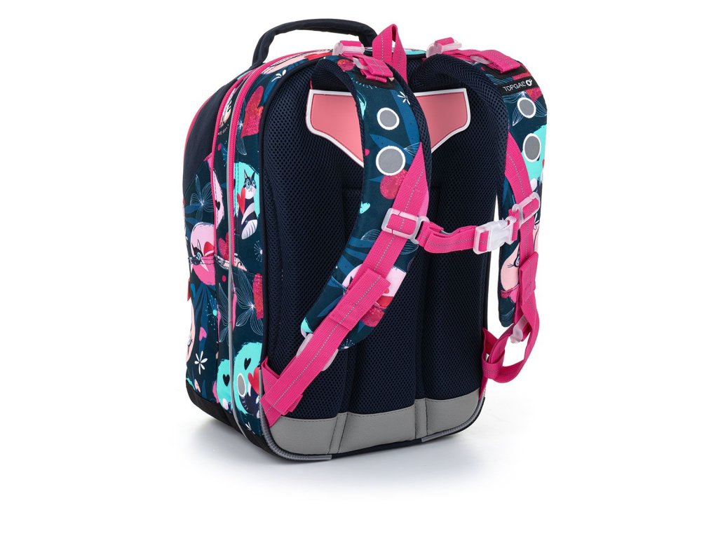 Tříkomorový model COCO je oblíbeným střihem drobných slečen v první třídě, ale i školaček ve vyšších ročnících prvního stupně ZŠ. Roztomilá kočičí smečka v kombinaci s růžovými srdíčky krásně vynikne na tmavém podkladu.