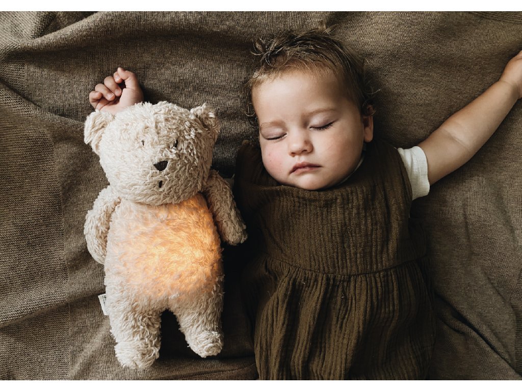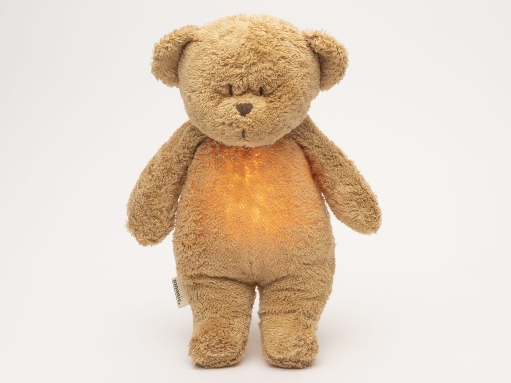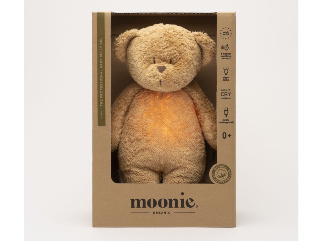 Moonie usínáček v podobě roztomilého medvídka s nočním světlem a relaxačními zvuky pomáhá miminku uklidnit se a snáze usnout. Uklidňující zvuky připomínají dítěti prostředí v děloze maminky před jeho narozením. Usínáček nabízí pět přírodních relaxačních zvuků (tlukot srdce, vítr, lesní potok, mořské vlny, déšť), kalimba ukolébavku, dvě klasické ukolébavky a umožňuje nahrání vlastního hlasu. Bříško medvídka svítí a slouží jako noční světlo s výběrem sedmi barev svícení. Jemné světlo pomáhá dítěti cítit se v postýlce bezpečně. Světlo je možné zapnout i bez zvuků. Při zapnuté funkci Shake světlo zapnete zatřesením hračkou. Medvídek se při svícení nijak nezahřívá a je pro dítě zcela bezpečný. Funkce časovače umožňuje nastavit dobu přehrávání na 30, 60 nebo 90 minut, než modul přejde do režimu inteligentního senzoru pláče. Inteligentní senzor aktivuje zvuk a světlo, když dítě začne plakat. Hračka pak přehrává relaxační zvuky a jemně svítí po dobu 20 minut. Hudební modul umožňuje nastavení hlasitosti a doby přehrávání dle vašich preferencí. Hračka se dobíjí s pomocí USB kabelu, k plnému nabití potřebuje 3 hodiny. Plně nabitá baterie vydrží až 8 hodin nepřetržitého provozu se zapnutým světlem a zvukem. USB kabel je součástí balení. Po vyjmutí zvukového a svítícího modulu můžete hračku prát v ruce. Medvídek je součástí produktové řady Moonie Organic, vyráběné z cetifikované organické bavlny, barvené netoxickými barvami. Bavlna pochází z produkce bez použití pesticidů a toxických hnojiv. Při pěstování organické bavlny se používá o 50% méně vody ve srovnání s průmyslovým pěstováním. Výplň hračky tvoří recyklovaný materiál. Hračka byla testována švýcarskou laboratoří SGS a je v souladu se směrnicí 2009/48/ES o bezpečnosti hraček. Rozměry: 28 x 16 x 10,5 cm Vhodné pro děti od narození.Doplňkové parametry