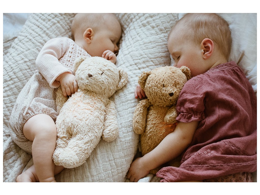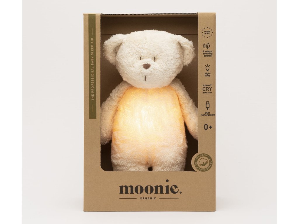 Moonie usínáček v podobě roztomilého medvídka s nočním světlem a relaxačními zvuky pomáhá miminku uklidnit se a snáze usnout. Uklidňující zvuky připomínají dítěti prostředí v děloze maminky před jeho narozením. Usínáček nabízí pět přírodních relaxačních zvuků (tlukot srdce, vítr, lesní potok, mořské vlny, déšť), kalimba ukolébavku, dvě klasické ukolébavky a umožňuje nahrání vlastního hlasu. Bříško medvídka svítí a slouží jako noční světlo s výběrem sedmi barev svícení. Jemné světlo pomáhá dítěti cítit se v postýlce bezpečně. Světlo je možné zapnout i bez zvuků. Při zapnuté funkci Shake světlo zapnete zatřesením hračkou. Medvídek se při svícení nijak nezahřívá a je pro dítě zcela bezpečný. Funkce časovače umožňuje nastavit dobu přehrávání na 30, 60 nebo 90 minut, než modul přejde do režimu inteligentního senzoru pláče. Inteligentní senzor aktivuje zvuk a světlo, když dítě začne plakat. Hračka pak přehrává relaxační zvuky a jemně svítí po dobu 20 minut. Hudební modul umožňuje nastavení hlasitosti a doby přehrávání dle vašich preferencí. Hračka se dobíjí s pomocí USB kabelu, k plnému nabití potřebuje 3 hodiny. Plně nabitá baterie vydrží až 8 hodin nepřetržitého provozu se zapnutým světlem a zvukem. USB kabel je součástí balení. Po vyjmutí zvukového a svítícího modulu můžete hračku prát v ruce. Medvídek je součástí produktové řady Moonie Organic, vyráběné z cetifikované organické bavlny, barvené netoxickými barvami. Bavlna pochází z produkce bez použití pesticidů a toxických hnojiv. Při pěstování organické bavlny se používá o 50% méně vody ve srovnání s průmyslovým pěstováním. Výplň hračky tvoří recyklovaný materiál. Hračka byla testována švýcarskou laboratoří SGS a je v souladu se směrnicí 2009/48/ES o bezpečnosti hraček. Rozměry: 28 x 16 x 10,5 cm Vhodné pro děti od narození.Doplňkové parametry