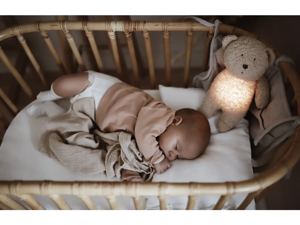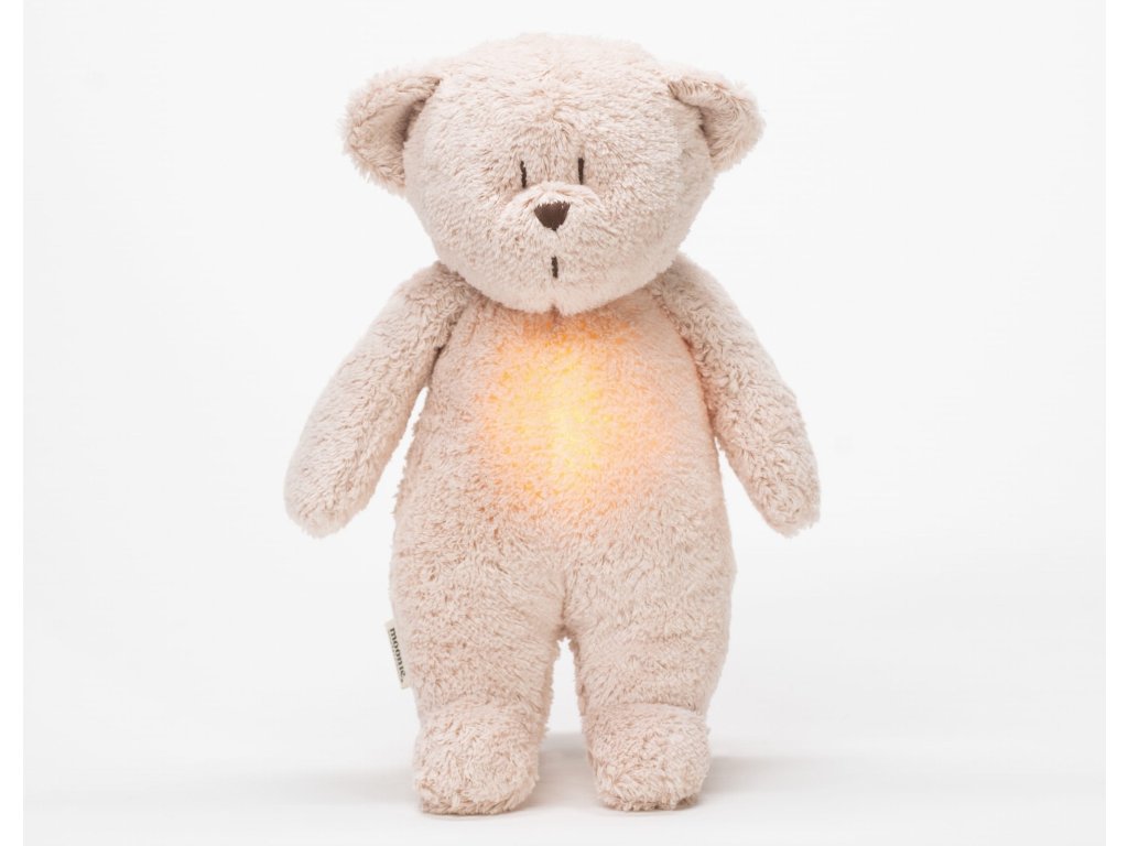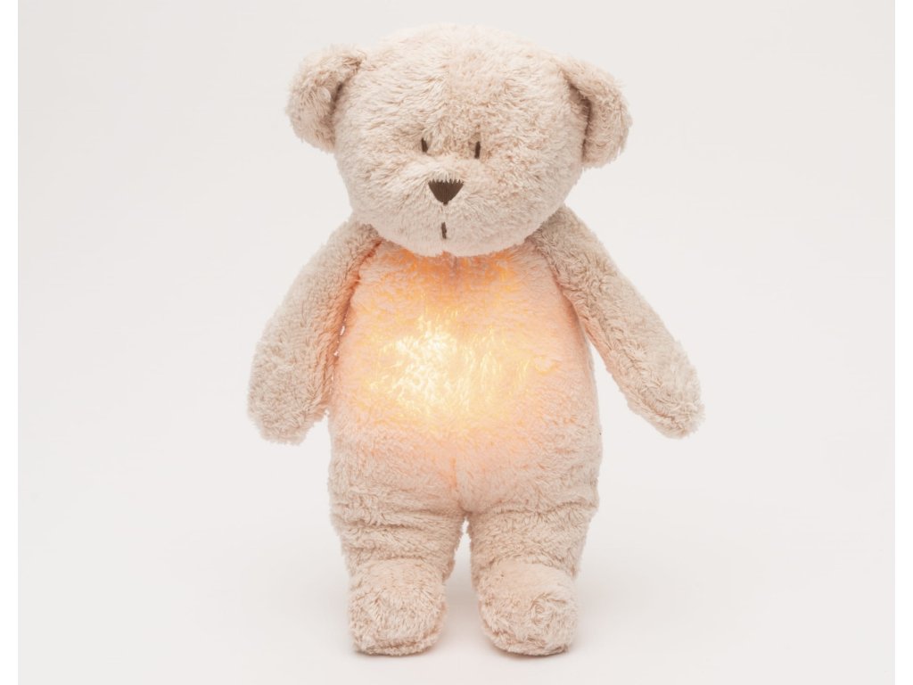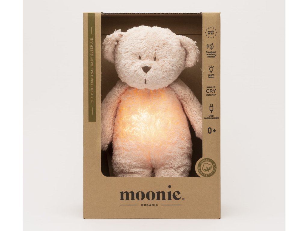 Moonie usínáček v podobě roztomilého medvídka s nočním světlem a relaxačními zvuky pomáhá miminku uklidnit se a snáze usnout. Uklidňující zvuky připomínají dítěti prostředí v děloze maminky před jeho narozením. Usínáček nabízí pět přírodních relaxačních zvuků (tlukot srdce, vítr, lesní potok, mořské vlny, déšť), kalimba ukolébavku, dvě klasické ukolébavky a umožňuje nahrání vlastního hlasu. Bříško medvídka svítí a slouží jako noční světlo s výběrem sedmi barev svícení. Jemné světlo pomáhá dítěti cítit se v postýlce bezpečně. Světlo je možné zapnout i bez zvuků. Při zapnuté funkci Shake světlo zapnete zatřesením hračkou. Medvídek se při svícení nijak nezahřívá a je pro dítě zcela bezpečný. Funkce časovače umožňuje nastavit dobu přehrávání na 30, 60 nebo 90 minut, než modul přejde do režimu inteligentního senzoru pláče. Inteligentní senzor aktivuje zvuk a světlo, když dítě začne plakat. Hračka pak přehrává relaxační zvuky a jemně svítí po dobu 20 minut. Hudební modul umožňuje nastavení hlasitosti a doby přehrávání dle vašich preferencí. Hračka se dobíjí s pomocí USB kabelu, k plnému nabití potřebuje 3 hodiny. Plně nabitá baterie vydrží až 8 hodin nepřetržitého provozu se zapnutým světlem a zvukem. USB kabel je součástí balení. Po vyjmutí zvukového a svítícího modulu můžete hračku prát v ruce. Medvídek je součástí produktové řady Moonie Organic, vyráběné z cetifikované organické bavlny, barvené netoxickými barvami. Bavlna pochází z produkce bez použití pesticidů a toxických hnojiv. Při pěstování organické bavlny se používá o 50% méně vody ve srovnání s průmyslovým pěstováním. Výplň hračky tvoří recyklovaný materiál. Hračka byla testována švýcarskou laboratoří SGS a je v souladu se směrnicí 2009/48/ES o bezpečnosti hraček. Rozměry: 28 x 16 x 10,5 cm Vhodné pro děti od narození.Doplňkové parametry