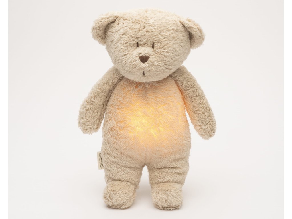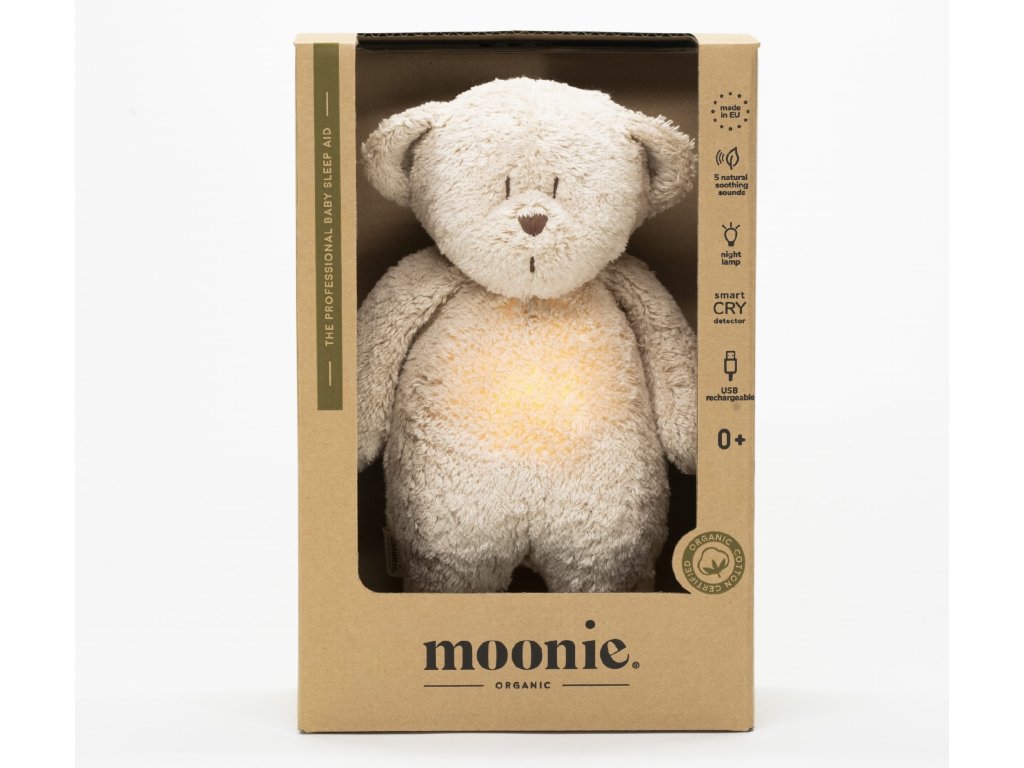 Moonie usínáček v podobě roztomilého medvídka s nočním světlem a relaxačními zvuky pomáhá miminku uklidnit se a snáze usnout. Uklidňující zvuky připomínají dítěti prostředí v děloze maminky před jeho narozením. Usínáček nabízí pět přírodních relaxačních zvuků (tlukot srdce, vítr, lesní potok, mořské vlny, déšť), kalimba ukolébavku, dvě klasické ukolébavky a umožňuje nahrání vlastního hlasu. Bříško medvídka svítí a slouží jako noční světlo s výběrem sedmi barev svícení. Jemné světlo pomáhá dítěti cítit se v postýlce bezpečně. Světlo je možné zapnout i bez zvuků. Při zapnuté funkci Shake světlo zapnete zatřesením hračkou. Medvídek se při svícení nijak nezahřívá a je pro dítě zcela bezpečný. Funkce časovače umožňuje nastavit dobu přehrávání na 30, 60 nebo 90 minut, než modul přejde do režimu inteligentního senzoru pláče. Inteligentní senzor aktivuje zvuk a světlo, když dítě začne plakat. Hračka pak přehrává relaxační zvuky a jemně svítí po dobu 20 minut. Hudební modul umožňuje nastavení hlasitosti a doby přehrávání dle vašich preferencí. Hračka se dobíjí s pomocí USB kabelu, k plnému nabití potřebuje 3 hodiny. Plně nabitá baterie vydrží až 8 hodin nepřetržitého provozu se zapnutým světlem a zvukem. USB kabel je součástí balení. Po vyjmutí zvukového a svítícího modulu můžete hračku prát v ruce. Medvídek je součástí produktové řady Moonie Organic, vyráběné z cetifikované organické bavlny, barvené netoxickými barvami. Bavlna pochází z produkce bez použití pesticidů a toxických hnojiv. Při pěstování organické bavlny se používá o 50% méně vody ve srovnání s průmyslovým pěstováním. Výplň hračky tvoří recyklovaný materiál. Hračka byla testována švýcarskou laboratoří SGS a je v souladu se směrnicí 2009/48/ES o bezpečnosti hraček. Rozměry: 28 x 16 x 10,5 cm Vhodné pro děti od narození.Doplňkové parametry