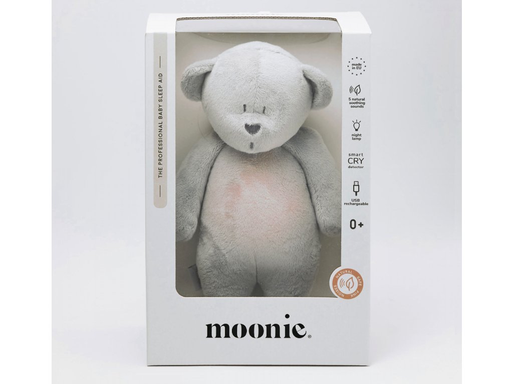 Moonie usínáček v podobě roztomilého medvídka s nočním světlem a relaxačními zvuky pomáhá miminku uklidnit se a snáze usnout. Uklidňující zvuky připomínají dítěti prostředí v děloze maminky před jeho narozením. Usínáček nabízí pět přírodních relaxačních zvuků (tlukot srdce, vítr, lesní potok, mořské vlny, déšť), kalimba ukolébavku, dvě klasické ukolébavky a umožňuje nahrání vlastního hlasu. Bříško medvídka svítí a slouží jako noční světlo s výběrem sedmi barev svícení. Jemné světlo pomáhá dítěti cítit se v postýlce bezpečně. Světlo je možné zapnout i bez zvuků. Při zapnuté funkci Shake světlo zapnete zatřesením hračkou. Medvídek se při svícení nijak nezahřívá a je pro dítě zcela bezpečný. Funkce časovače umožňuje nastavit dobu přehrávání na 30, 60 nebo 90 minut, než modul přejde do režimu inteligentního senzoru pláče. Inteligentní senzor aktivuje zvuk a světlo, když dítě začne plakat. Hračka pak přehrává relaxační zvuky a jemně svítí po dobu 20 minut. Hudební modul umožňuje nastavení hlasitosti a doby přehrávání dle vašich preferencí. Hračka se dobíjí s pomocí USB kabelu, k plnému nabití potřebuje 3 hodiny. Plně nabitá baterie vydrží až 8 hodin nepřetržitého provozu se zapnutým světlem a zvukem. USB kabel je součástí balení. Po vyjmutí zvukového a svítícího modulu můžete hračku prát v pračce. Moonie medvídek je vyroben z nejkvalitnějších, certifikovaných a bezpečných materiálů pro děti. Hračka byla testována švýcarskou laboratoří SGS a je v souladu se směrnicí 2009/48/ES o bezpečnosti hraček. Všechny materiály, ze kterých je medvídek MOONIE vyroben, jsou certifikovány OEKO-TEX a jsou super jemné a příjemné na dotek. Rozměry: 28 x 16 x 10,5 cm Vhodné pro děti od narození.Doplňkové parametry