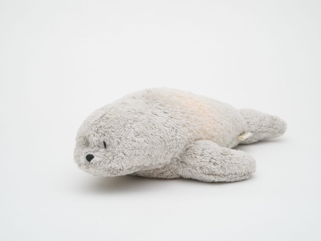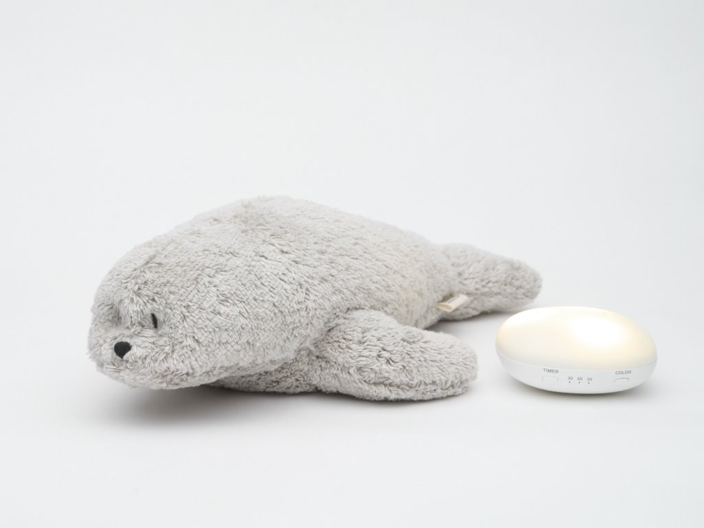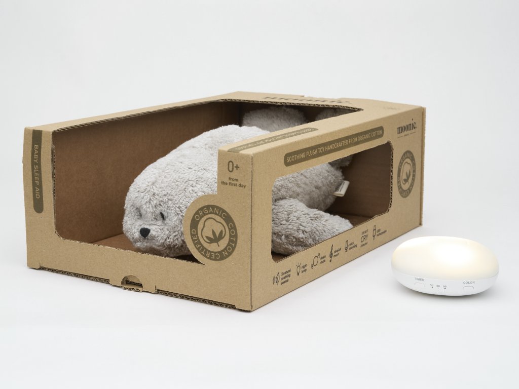 Moonie usínáček v podobě roztomilého tuleně s nočním světlem a relaxačními zvuky pomáhá miminku uklidnit se a snáze usnout. Uklidňující zvuky připomínají dítěti prostředí v děloze maminky před jeho narozením. Usínáček nabízí pět přírodních relaxačních zvuků (tlukot srdce, vítr, lesní potok, mořské vlny, déšť), kalimba ukolébavku, dvě klasické ukolébavky a umožňuje nahrání vlastního hlasu. Bříško tuleně svítí a slouží jako noční světlo s výběrem sedmi barev svícení. Jemné světlo pomáhá dítěti cítit se v postýlce bezpečně. Světlo je možné zapnout i bez zvuků. Při zapnuté funkci Shake světlo zapnete zatřesením hračkou. Tuleň se při svícení nijak nezahřívá a je pro dítě zcela bezpečný. Funkce časovače umožňuje nastavit dobu přehrávání na 30, 60 nebo 90 minut, než modul přejde do režimu inteligentního senzoru pláče. Inteligentní senzor aktivuje zvuk a světlo, když dítě začne plakat. Hračka pak přehrává relaxační zvuky a jemně svítí po dobu 20 minut. Hudební modul umožňuje nastavení hlasitosti a doby přehrávání dle vašich preferencí. Hračka se dobíjí s pomocí USB kabelu, k plnému nabití potřebuje 3 hodiny. Plně nabitá baterie vydrží až 8 hodin nepřetržitého provozu se zapnutým světlem a zvukem. USB kabel je součástí balení. Po vyjmutí zvukového a svítícího modulu můžete hračku prát v ruce. Tuleň je součástí produktové řady Moonie Organic, vyráběné z cetifikované organické bavlny, barvené netoxickými barvami. Bavlna pochází z produkce bez použití pesticidů a toxických hnojiv. Při pěstování organické bavlny se používá o 50% méně vody ve srovnání s průmyslovým pěstováním. Výplň hračky tvoří recyklovaný materiál. Hračka byla testována švýcarskou laboratoří SGS a je v souladu se směrnicí 2009/48/ES o bezpečnosti hraček. Vhodné pro děti od narození.Doplňkové parametry