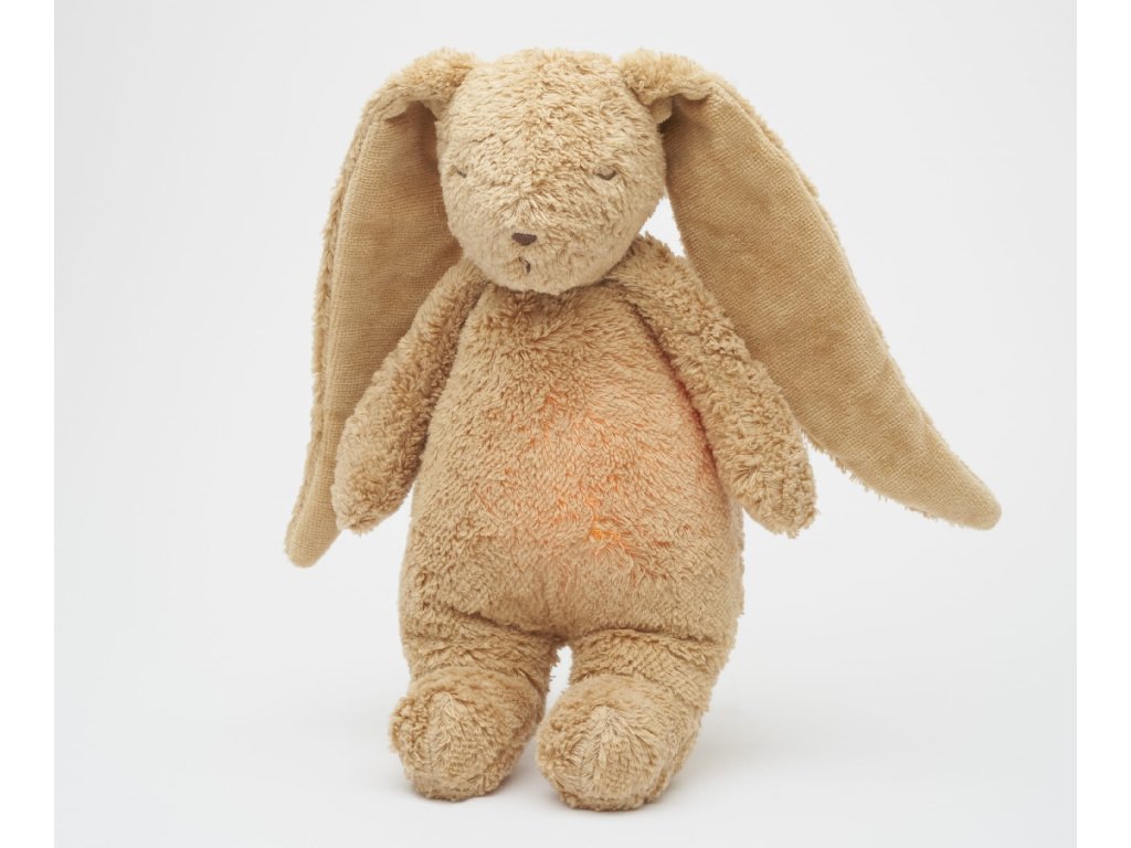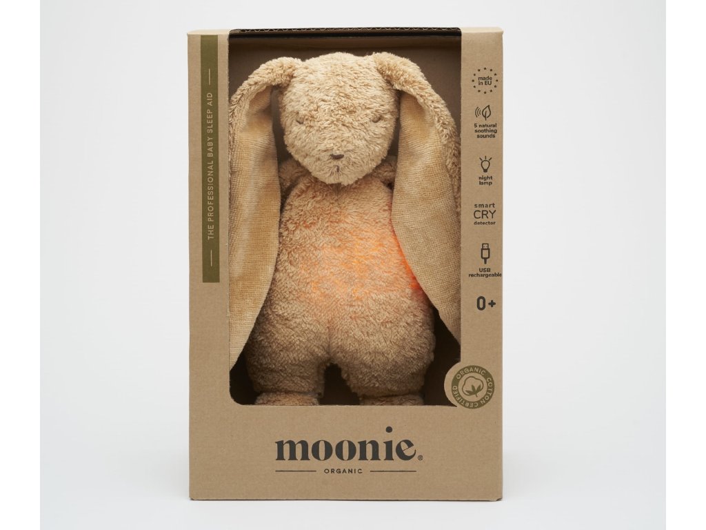 Moonie usínáček v podobě roztomilého zajíčka s nočním světlem a relaxačními zvuky pomáhá miminku uklidnit se a snáze usnout. Uklidňující zvuky připomínají dítěti prostředí v děloze maminky před jeho narozením. Usínáček nabízí pět přírodních relaxačních zvuků (tlukot srdce, vítr, lesní potok, mořské vlny, déšť), kalimba ukolébavku, dvě klasické ukolébavky a umožňuje nahrání vlastního hlasu. Bříško zajíčka svítí a slouží jako noční světlo s výběrem sedmi barev svícení. Jemné světlo pomáhá dítěti cítit se v postýlce bezpečně. Světlo je možné zapnout i bez zvuků. Při zapnuté funkci Shake světlo zapnete zatřesením hračkou. Zajíček se při svícení nijak nezahřívá a je pro dítě zcela bezpečný. Funkce časovače umožňuje nastavit dobu přehrávání na 30, 60 nebo 90 minut, než modul přejde do režimu inteligentního senzoru pláče. Inteligentní senzor aktivuje zvuk a světlo, když dítě začne plakat. Hračka pak přehrává relaxační zvuky a jemně svítí po dobu 20 minut. Hudební modul umožňuje nastavení hlasitosti a doby přehrávání dle vašich preferencí. Hračka se dobíjí s pomocí USB kabelu, k plnému nabití potřebuje 3 hodiny. Plně nabitá baterie vydrží až 8 hodin nepřetržitého provozu se zapnutým světlem a zvukem. USB kabel je součástí balení. Po vyjmutí zvukového a svítícího modulu můžete hračku prát v ruce. Zajíček je součástí produktové řady Moonie Organic, vyráběné z cetifikované organické bavlny, barvené netoxickými barvami. Bavlna pochází z produkce bez použití pesticidů a toxických hnojiv. Při pěstování organické bavlny se používá o 50% méně vody ve srovnání s průmyslovým pěstováním. Výplň hračky tvoří recyklovaný materiál. Hračka byla testována švýcarskou laboratoří SGS a je v souladu se směrnicí 2009/48/ES o bezpečnosti hraček. Rozměry: 28 x 16 x 10,5 cm Vhodné pro děti od narození.Doplňkové parametry