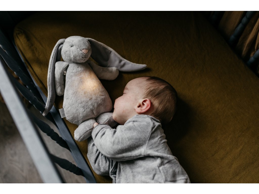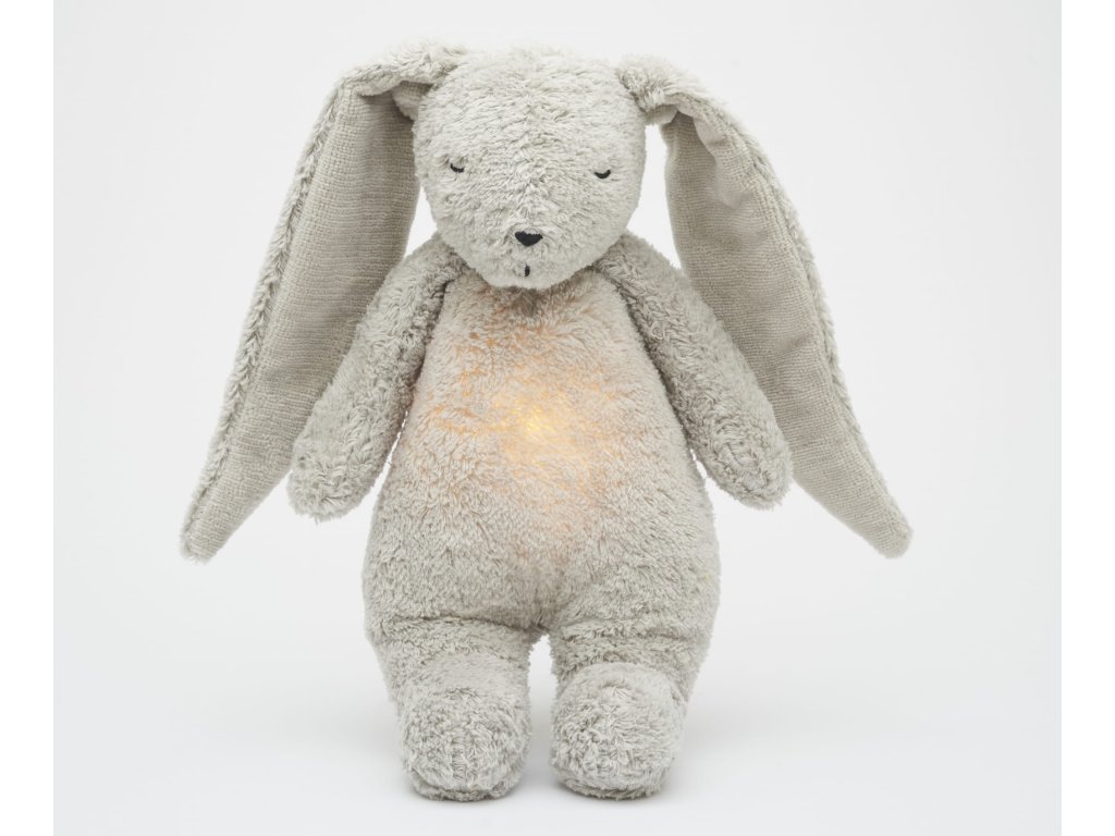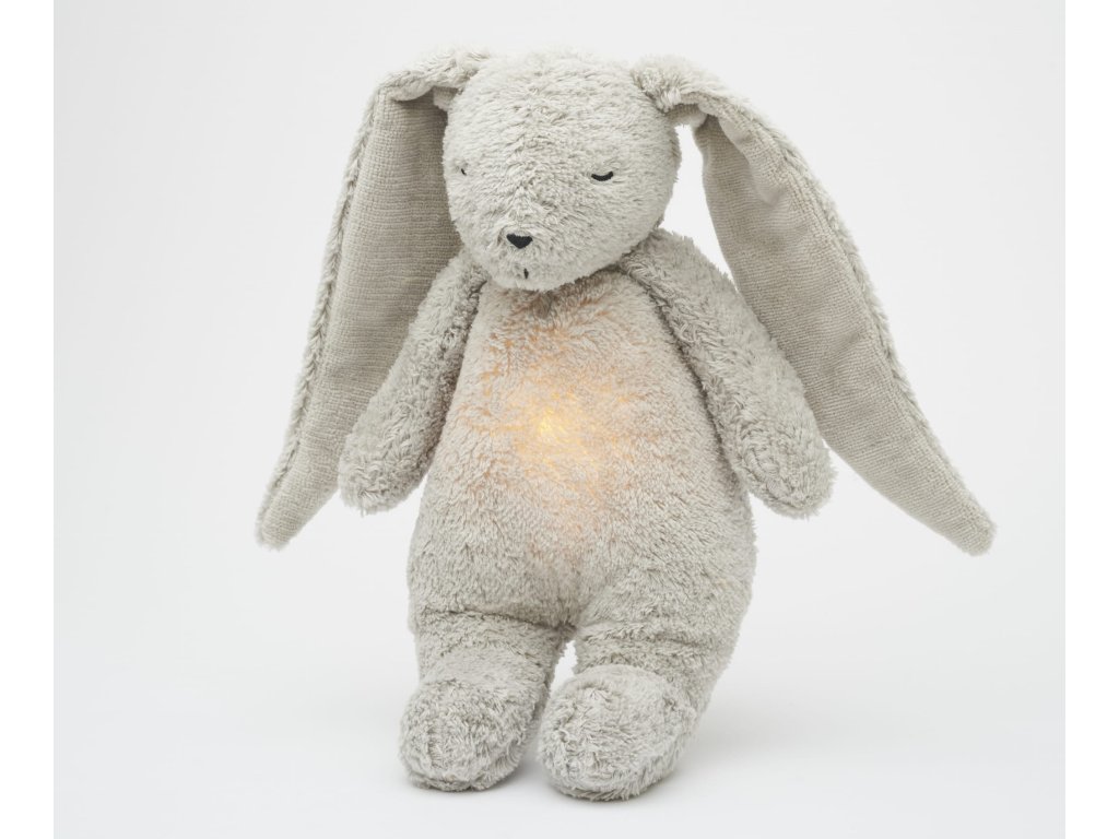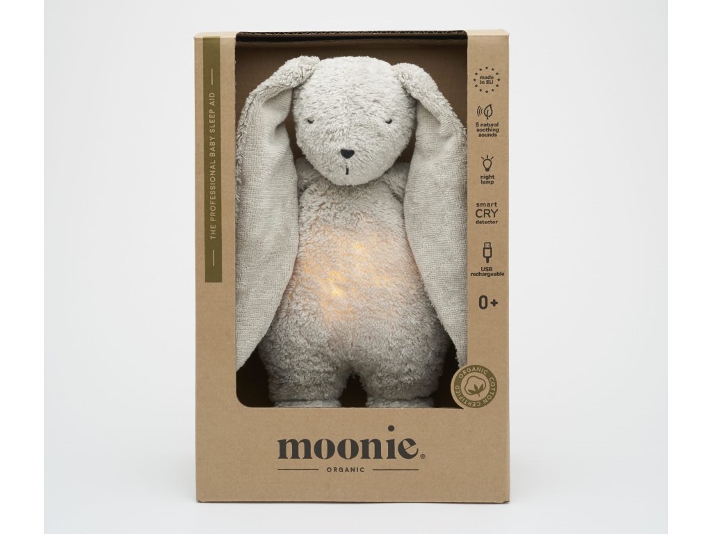 Moonie usínáček v podobě roztomilého zajíčka s nočním světlem a relaxačními zvuky pomáhá miminku uklidnit se a snáze usnout. Uklidňující zvuky připomínají dítěti prostředí v děloze maminky před jeho narozením. Usínáček nabízí pět přírodních relaxačních zvuků (tlukot srdce, vítr, lesní potok, mořské vlny, déšť), kalimba ukolébavku, dvě klasické ukolébavky a umožňuje nahrání vlastního hlasu. Bříško zajíčka svítí a slouží jako noční světlo s výběrem sedmi barev svícení. Jemné světlo pomáhá dítěti cítit se v postýlce bezpečně. Světlo je možné zapnout i bez zvuků. Při zapnuté funkci Shake světlo zapnete zatřesením hračkou. Zajíček se při svícení nijak nezahřívá a je pro dítě zcela bezpečný. Funkce časovače umožňuje nastavit dobu přehrávání na 30, 60 nebo 90 minut, než modul přejde do režimu inteligentního senzoru pláče. Inteligentní senzor aktivuje zvuk a světlo, když dítě začne plakat. Hračka pak přehrává relaxační zvuky a jemně svítí po dobu 20 minut. Hudební modul umožňuje nastavení hlasitosti a doby přehrávání dle vašich preferencí. Hračka se dobíjí s pomocí USB kabelu, k plnému nabití potřebuje 3 hodiny. Plně nabitá baterie vydrží až 8 hodin nepřetržitého provozu se zapnutým světlem a zvukem. USB kabel je součástí balení. Po vyjmutí zvukového a svítícího modulu můžete hračku prát v ruce. Zajíček je součástí produktové řady Moonie Organic, vyráběné z cetifikované organické bavlny, barvené netoxickými barvami. Bavlna pochází z produkce bez použití pesticidů a toxických hnojiv. Při pěstování organické bavlny se používá o 50% méně vody ve srovnání s průmyslovým pěstováním. Výplň hračky tvoří recyklovaný materiál. Hračka byla testována švýcarskou laboratoří SGS a je v souladu se směrnicí 2009/48/ES o bezpečnosti hraček. Rozměry: 28 x 16 x 10,5 cm Vhodné pro děti od narození.Doplňkové parametry