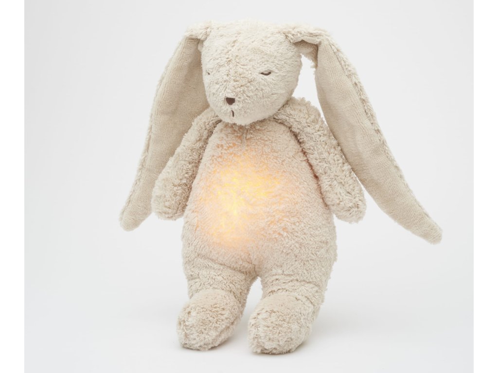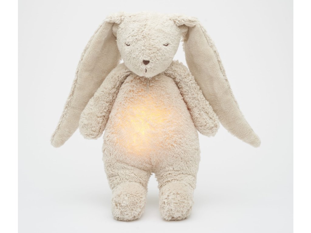 Moonie usínáček v podobě roztomilého zajíčka s nočním světlem a relaxačními zvuky pomáhá miminku uklidnit se a snáze usnout. Uklidňující zvuky připomínají dítěti prostředí v děloze maminky před jeho narozením. Usínáček nabízí pět přírodních relaxačních zvuků (tlukot srdce, vítr, lesní potok, mořské vlny, déšť), kalimba ukolébavku, dvě klasické ukolébavky a umožňuje nahrání vlastního hlasu. Bříško zajíčka svítí a slouží jako noční světlo s výběrem sedmi barev svícení. Jemné světlo pomáhá dítěti cítit se v postýlce bezpečně. Světlo je možné zapnout i bez zvuků. Při zapnuté funkci Shake světlo zapnete zatřesením hračkou. Zajíček se při svícení nijak nezahřívá a je pro dítě zcela bezpečný. Funkce časovače umožňuje nastavit dobu přehrávání na 30, 60 nebo 90 minut, než modul přejde do režimu inteligentního senzoru pláče. Inteligentní senzor aktivuje zvuk a světlo, když dítě začne plakat. Hračka pak přehrává relaxační zvuky a jemně svítí po dobu 20 minut. Hudební modul umožňuje nastavení hlasitosti a doby přehrávání dle vašich preferencí. Hračka se dobíjí s pomocí USB kabelu, k plnému nabití potřebuje 3 hodiny. Plně nabitá baterie vydrží až 8 hodin nepřetržitého provozu se zapnutým světlem a zvukem. USB kabel je součástí balení. Po vyjmutí zvukového a svítícího modulu můžete hračku prát v ruce. Zajíček je součástí produktové řady Moonie Organic, vyráběné z cetifikované organické bavlny, barvené netoxickými barvami. Bavlna pochází z produkce bez použití pesticidů a toxických hnojiv. Při pěstování organické bavlny se používá o 50% méně vody ve srovnání s průmyslovým pěstováním. Výplň hračky tvoří recyklovaný materiál. Hračka byla testována švýcarskou laboratoří SGS a je v souladu se směrnicí 2009/48/ES o bezpečnosti hraček. Rozměry: 28 x 16 x 10,5 cm Vhodné pro děti od narození.Doplňkové parametry