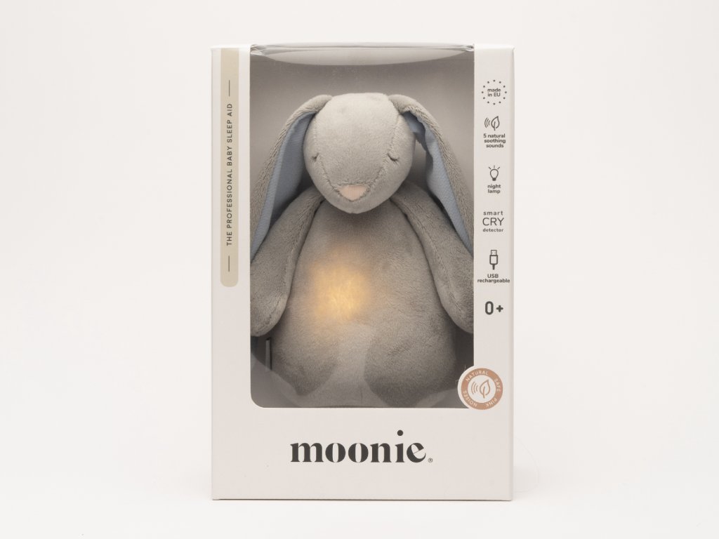 Moonie usínáček v podobě roztomilého zajíčka s nočním světlem a relaxačními zvuky pomáhá miminku uklidnit se a snáze usnout. Uklidňující zvuky připomínají dítěti prostředí v děloze maminky před jeho narozením. Usínáček nabízí pět přírodních relaxačních zvuků (tlukot srdce, vítr, lesní potok, mořské vlny, déšť), kalimba ukolébavku, dvě klasické ukolébavky a umožňuje nahrání vlastního hlasu. Bříško zajíčka svítí a slouží jako noční světlo s výběrem sedmi barev svícení. Jemné světlo pomáhá dítěti cítit se v postýlce bezpečně. Světlo je možné zapnout i bez zvuků. Při zapnuté funkci Shake světlo zapnete zatřesením hračkou. Zajíček se při svícení nijak nezahřívá a je pro dítě zcela bezpečný. Funkce časovače umožňuje nastavit dobu přehrávání na 30, 60 nebo 90 minut, než modul přejde do režimu inteligentního senzoru pláče. Inteligentní senzor aktivuje zvuk a světlo, když dítě začne plakat. Hračka pak přehrává relaxační zvuky a jemně svítí po dobu 20 minut. Hudební modul umožňuje nastavení hlasitosti a doby přehrávání dle vašich preferencí. Hračka se dobíjí s pomocí USB kabelu, k plnému nabití potřebuje 3 hodiny. Plně nabitá baterie vydrží až 8 hodin nepřetržitého provozu se zapnutým světlem a zvukem. USB kabel je součástí balení. Po vyjmutí zvukového a svítícího modulu můžete hračku prát v pračce. Moonie zajíček je vyroben z nejkvalitnějších, certifikovaných a bezpečných materiálů pro děti. Hračka byla testována švýcarskou laboratoří SGS a je v souladu se směrnicí 2009/48/ES o bezpečnosti hraček. Všechny materiály, ze kterých je zajíček MOONIE vyroben, jsou certifikovány OEKO-TEX a jsou super jemné a příjemné na dotek. Rozměry: 28 x 16 x 10,5 cm Vhodné pro děti od narození.Doplňkové parametry
