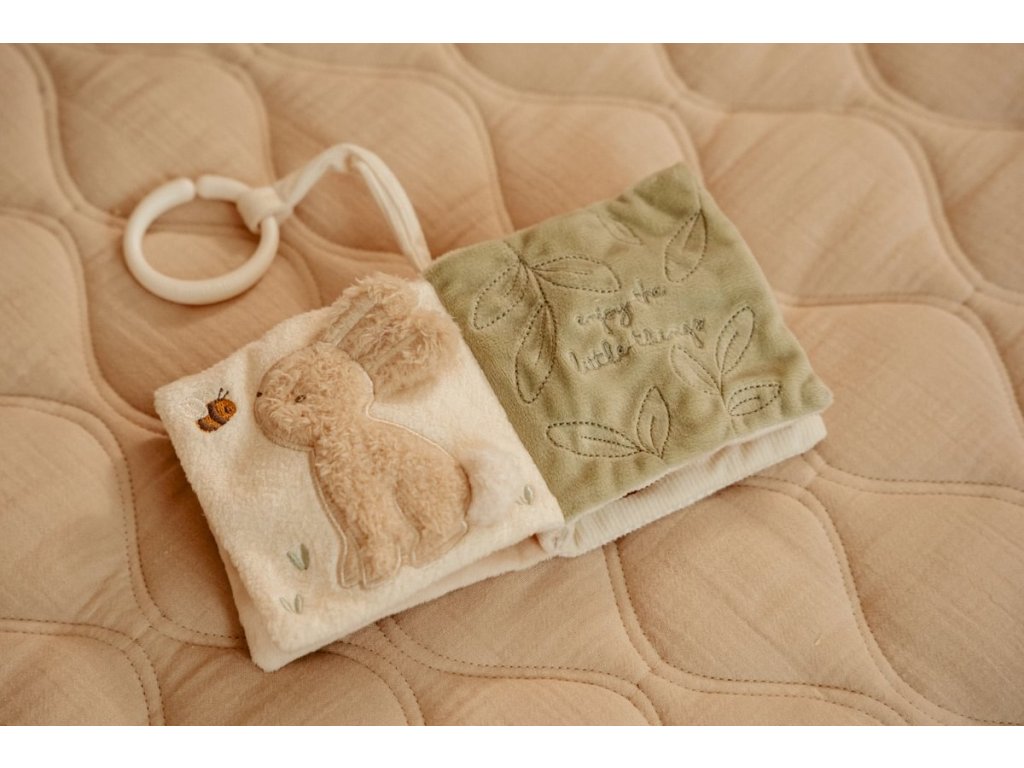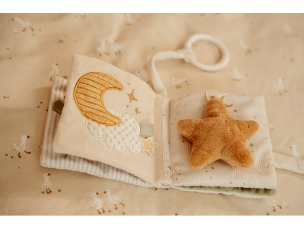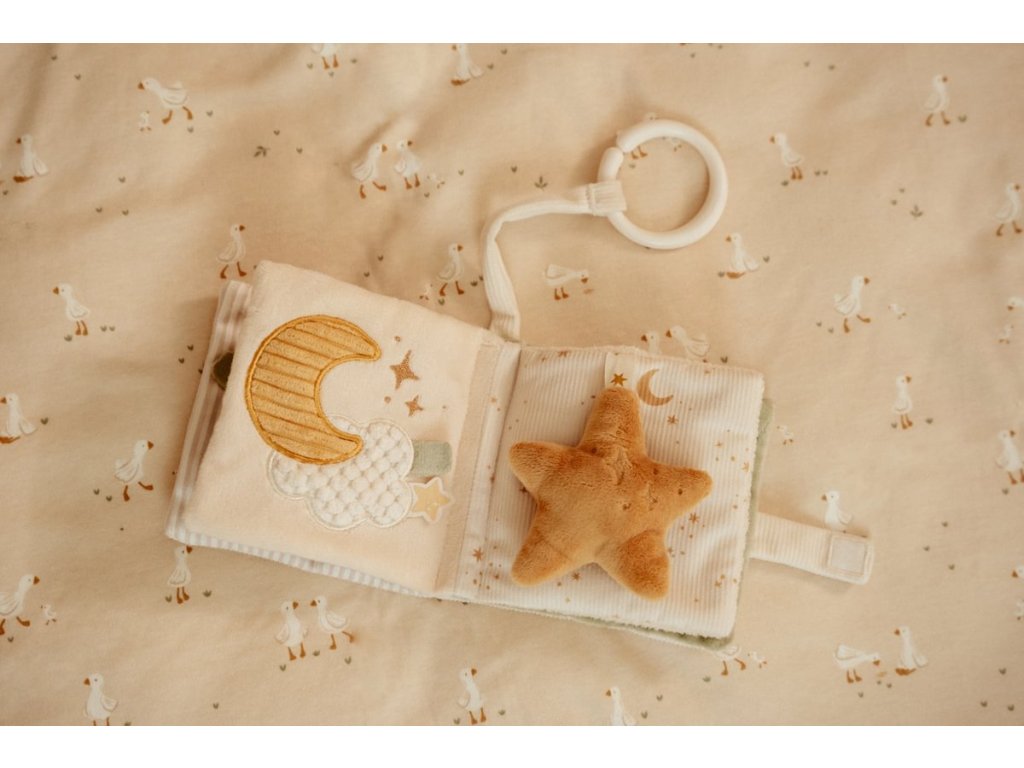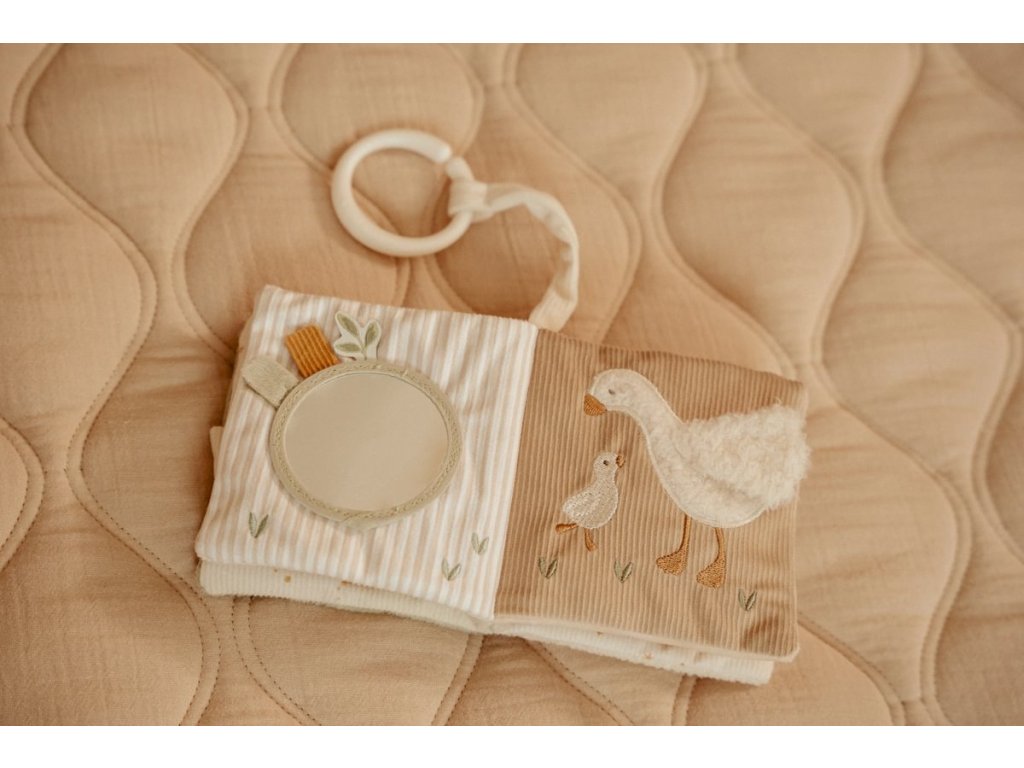 Měkká textilní knížka s krásnými motivy ze života husičky a králíčka upoutá pozornost vašeho dítěte množstvím aktivit, ukrytých na jednotlivých stránkách. Ke zkoumání a prohlížení lákají šusticí i pískací stránky, různorodé textury nebo např. bezpečné zrcátko. Knížka pomáhá rozvíjet jednotlivé smysly dítěte i koordinaci ruka / oko. Knížku můžete snadno zavěsit na kočárek, autosedačku či postýlku. Knížka je součástí designové kolekce hraček Little Dutch Newborn Naturals. Rozměry: 11 x 11 x 3 cm Složení: 100% polyester Možno prát v pračce na jemný program při 30°C. Vhodné od narození.Doplňkové parametry